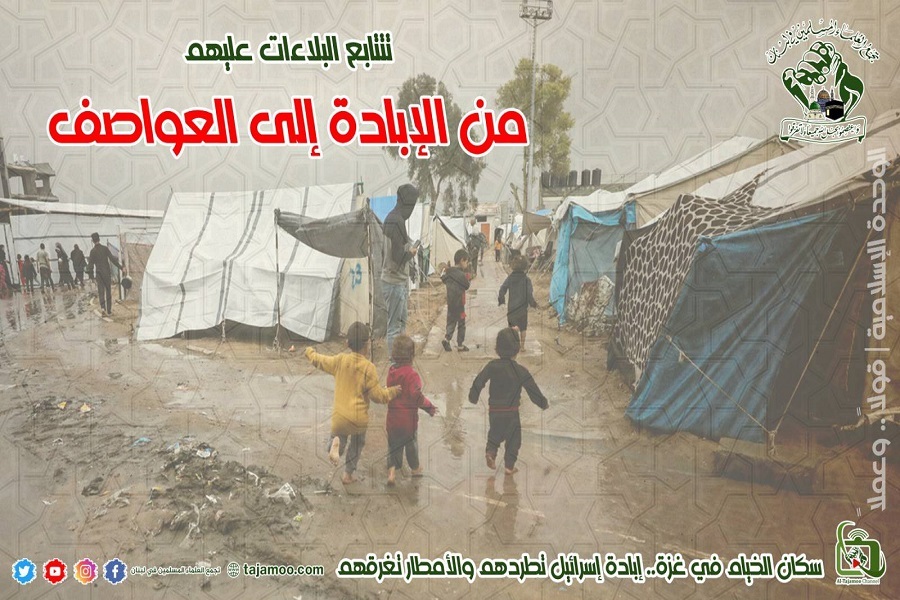 ثالثاً: يستنكر تجمع العلماء المسلمين الإهمال الدولي لمعاناة أهل غزة نتيجة غرق أماكن إيوائهم وهي خيم بالية لا تقوى على مواجهة العواصف والرياح والأمطار الغزيرة التي أدت إلى غرق 27 ألف خيمة بعد أن خربتها المياه أو جرفتها السيول أو الرياح الشديدة، وهذا ما دفع اللاجئين للاحتماء في مبانٍ متداعية بسبب القصف الصهيوني، الأمر الذي أدى إلى انهيار بعضها عليهم وارتقاء أكثر من 12 ضحية ما بين شهيد ومفقود. كل ذلك يُقابل بصمتٍ مريب من مؤسسات الإغاثة الدولية وخصوصاً الصليب الأحمر الدولي.