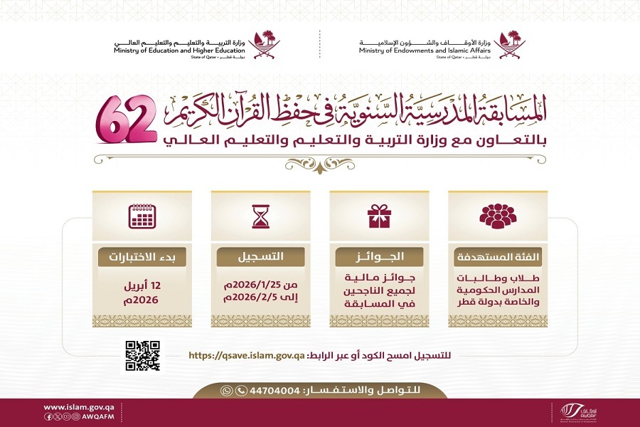 ودعت وزارة الأوقاف والشؤون الإسلامية أولياء الأمور وإدارات المدارس إلى استثمار هذه الفرصة وتشجيع الأبناء والبنات على المشاركة في هذه المسابقة القرآنية السنوية، والتي تسهم بشكل فعال في بناء جيل قرآني متميز علما وخلقا، يسير على هدي الكتاب والسنة ويخدم مجتمعه ووطنه.