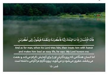 “মানুষকে যখন তার প্রতিপালক পরীক্ষা করে তাকে সম্মান ও নেয়ামত প্রদান করেন, তখন সে অহংকার করে বলে: ‘আমার প্রভু আমাকে সম্মানিত করেছেন।’”