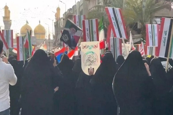IQNA: Irakische Frauen kamen am Samstag, um ihre Unterstützung für den Iran zu erklären und gegen die Maßnahmen Israels und USA zu protestieren, in die Straßen von Kadhimiya in Bagdad. (Quelle: RT)