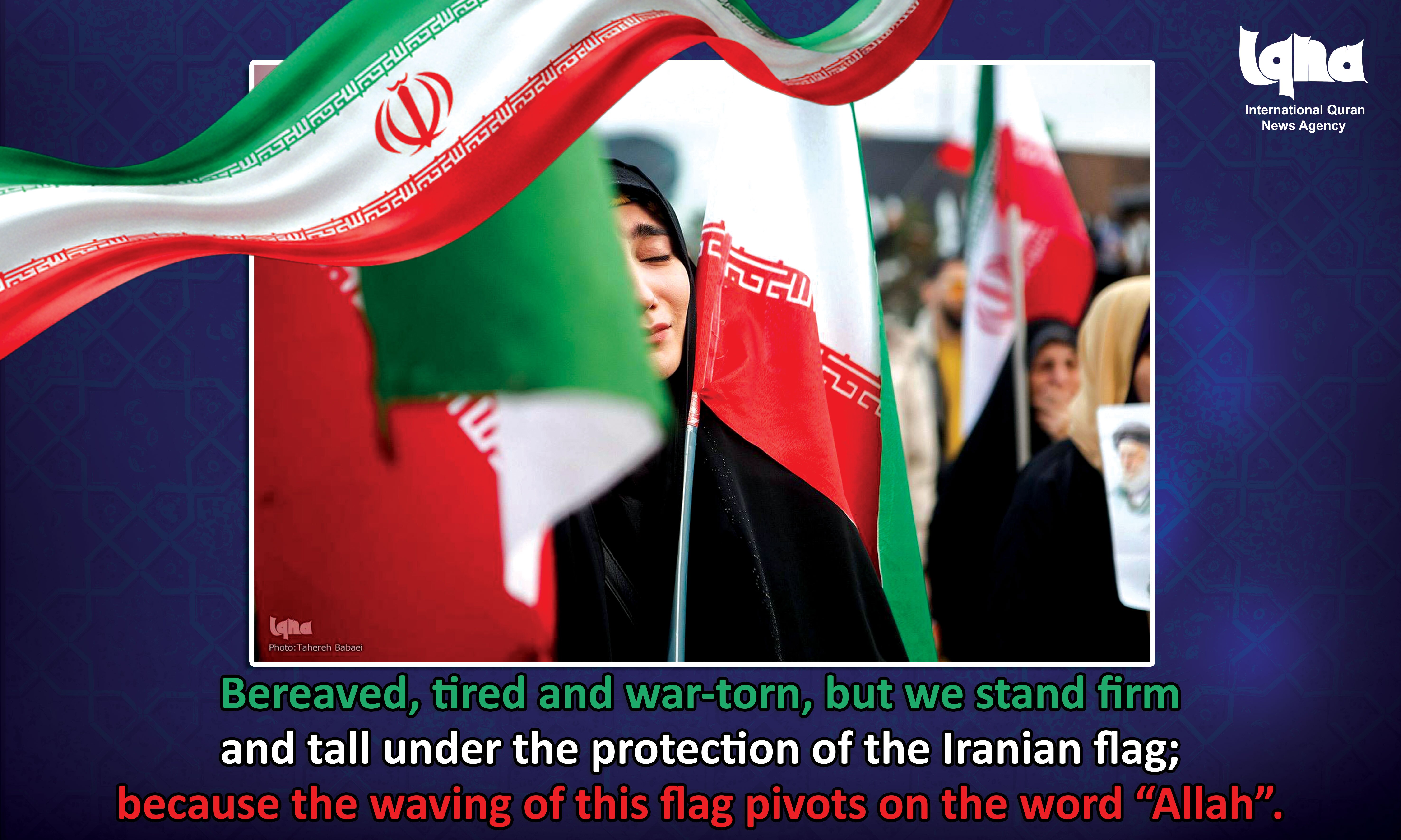 IQNA – Bereaved, tired and war-torn, but we stand firm and tall under the protection of the Iranian flag; because the waving of this flag pivots on the word “Allah”.