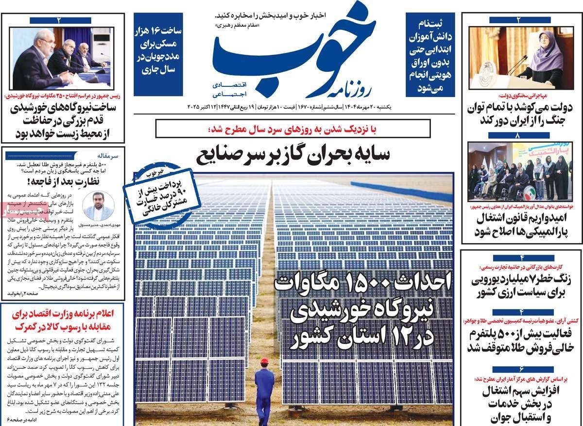 صفحه نخست روزنامههای یکشنبه ۲۰ مهر ۱۴۰۴ را که به وزنهبرداران ایران بر بام جهان، توسعه نیروگاههای خورشیدی، رمز ارزها در شوک و مهمترین رویدادهای ورزشی پرداختهاند؛ در ادامه مشاهده میکنید.