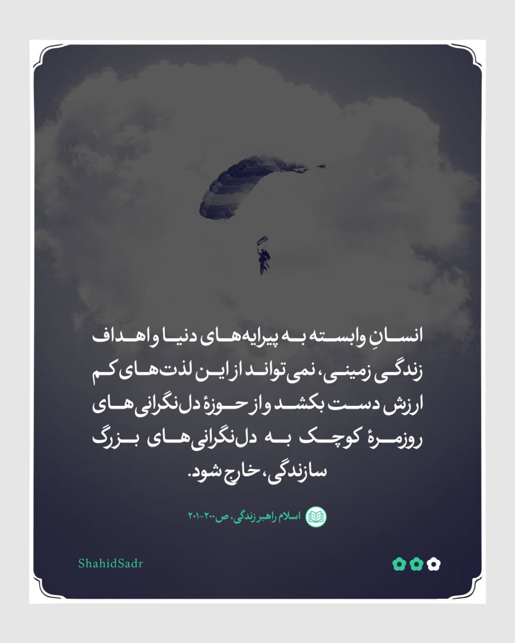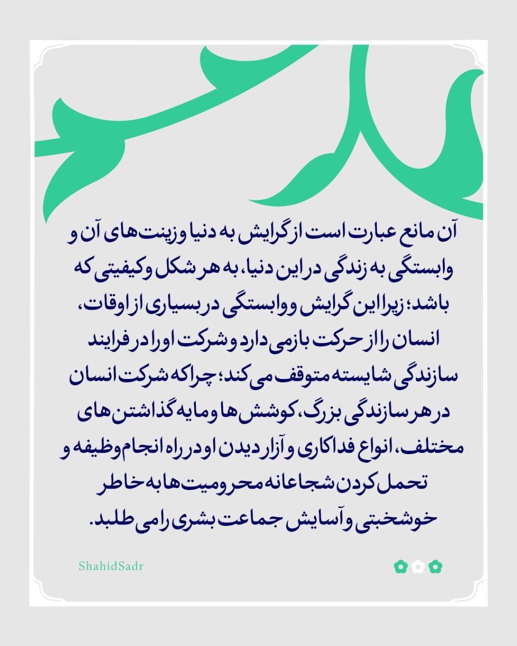 برپایی حق و عدالت و تحمل سختیهای سازندگیِ شایسته، نیازمند انگیزههایی است که از احساس مسئولیت و وظیفهشناسیِ انسان سرچشمه میگیرد. این انگیزهها همواره با مانعی روبه روست که نمیگذارد در انسان شکل گرفته یا رشد کنند. آن مانع عبارت است از گرایش به دنیا و زینتهای آن و وابستگی به زندگی در این دنیا، به هر شکل و کیفیتی که باشد؛ زیرا این گرایش و وابستگی در بسیاری از اوقات، انسان را از حرکت بازمیدارد و شرکت او را در فرایند سازندگی شایسته متوقف میکند. [شهید سید محمدباقر صدر؛ کتاب اسلام راهبر زندگی، ص٢٠٠-٢٠١]