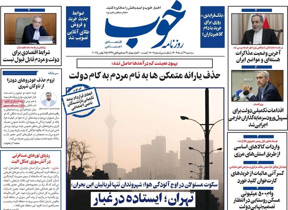 صفحه نخست روزنامههای سهشنبه ۴ آذر ۱۴۰۴ را که به کلانشهرها زیر گنبد دود، بیعت فاطمی با شهدا، دادخواهی در لاهه و مهمترین رویدادهای ورزشی پرداختهاند؛ در ادامه مشاهده میکنید.