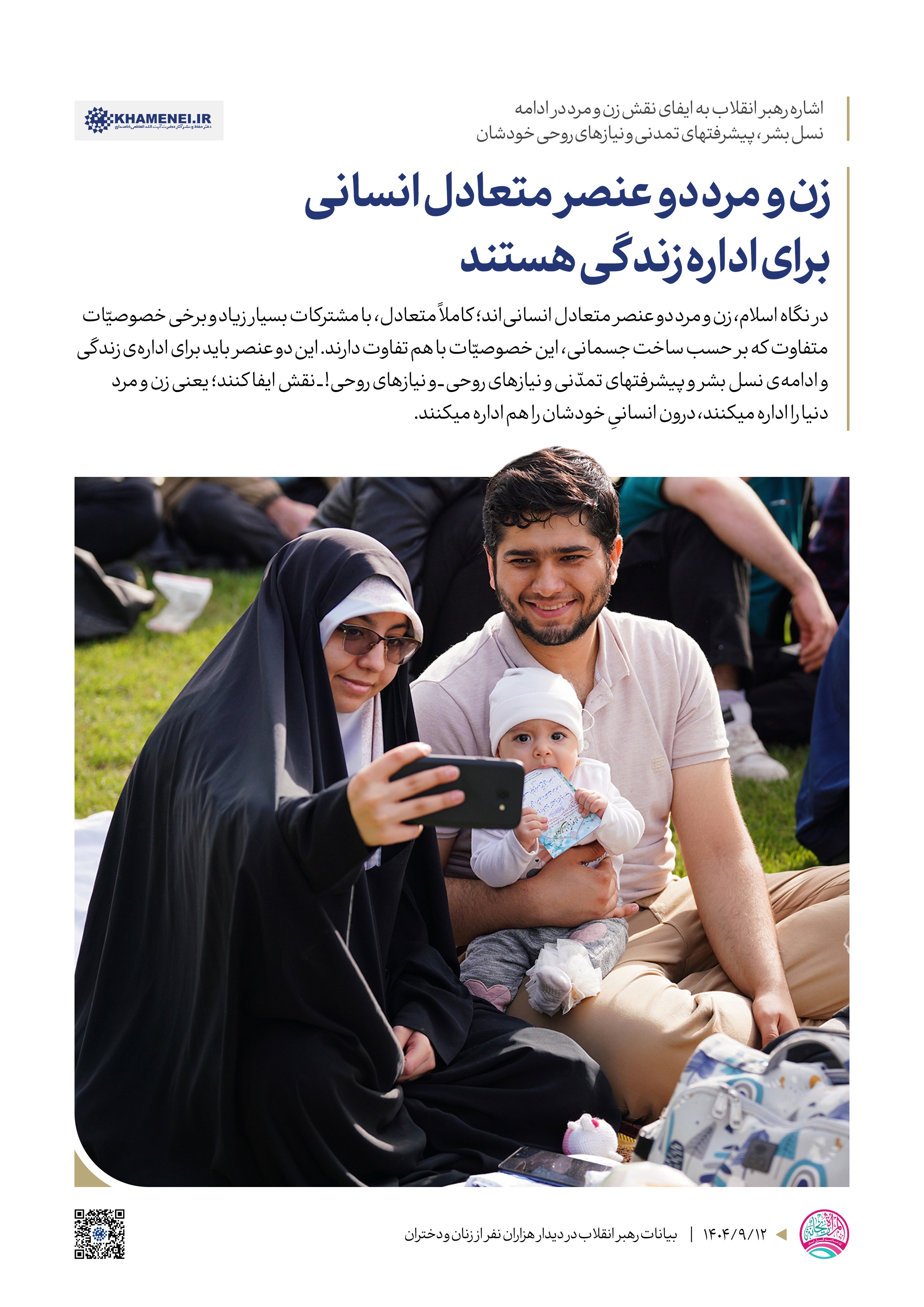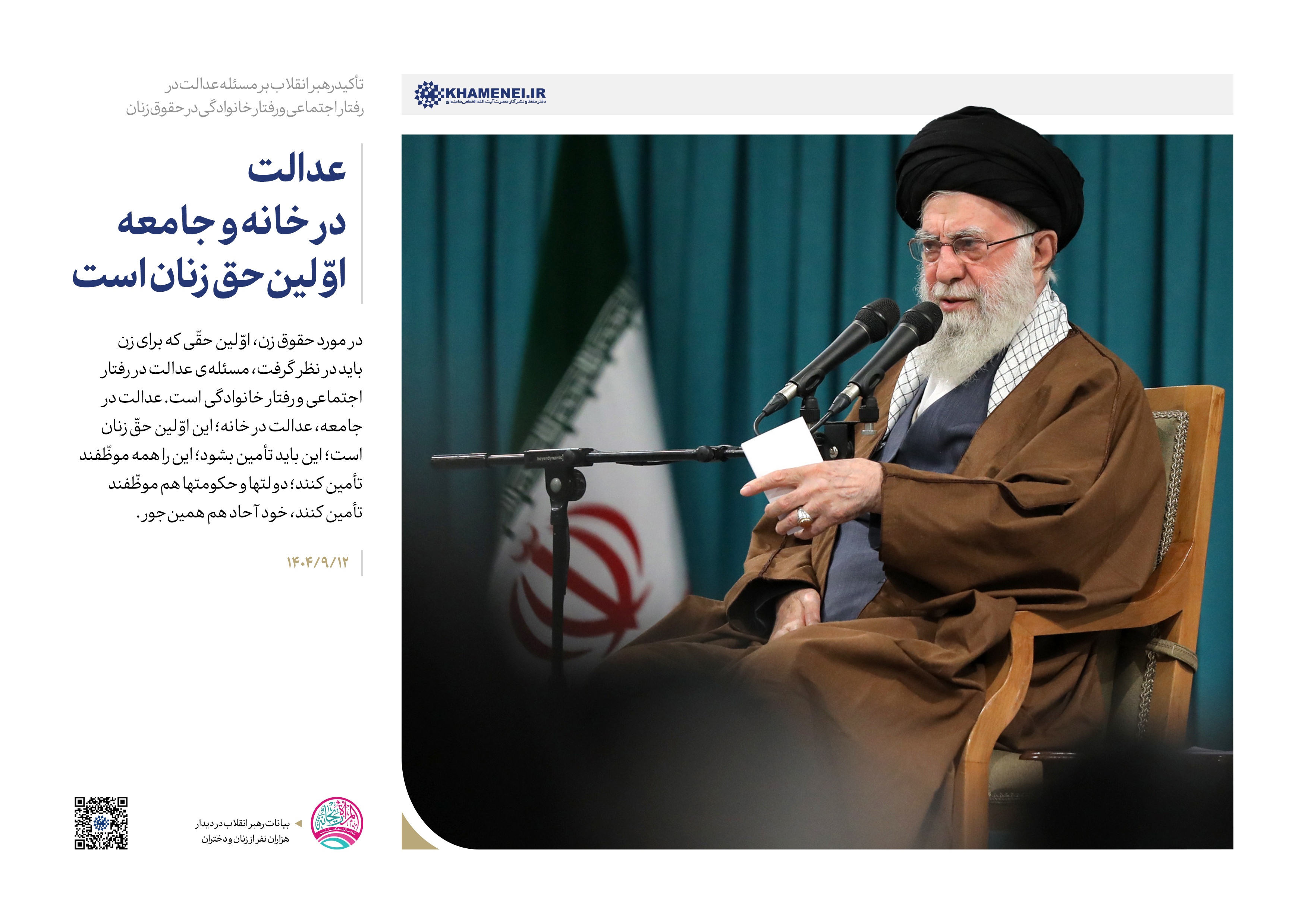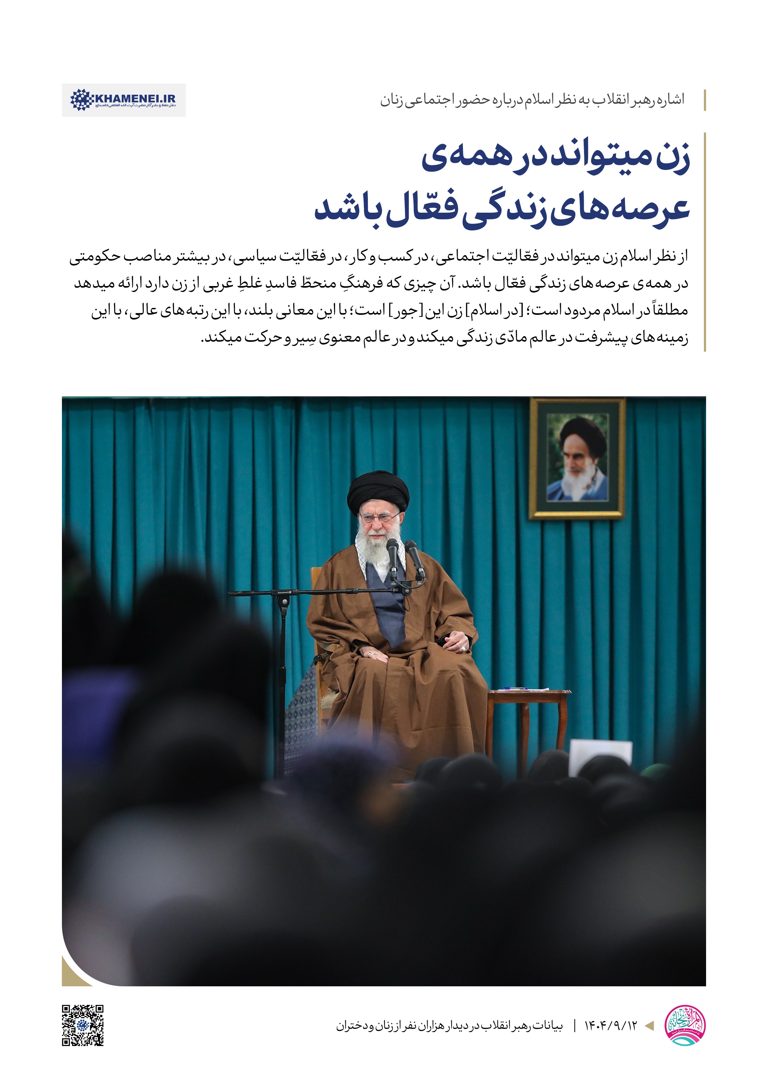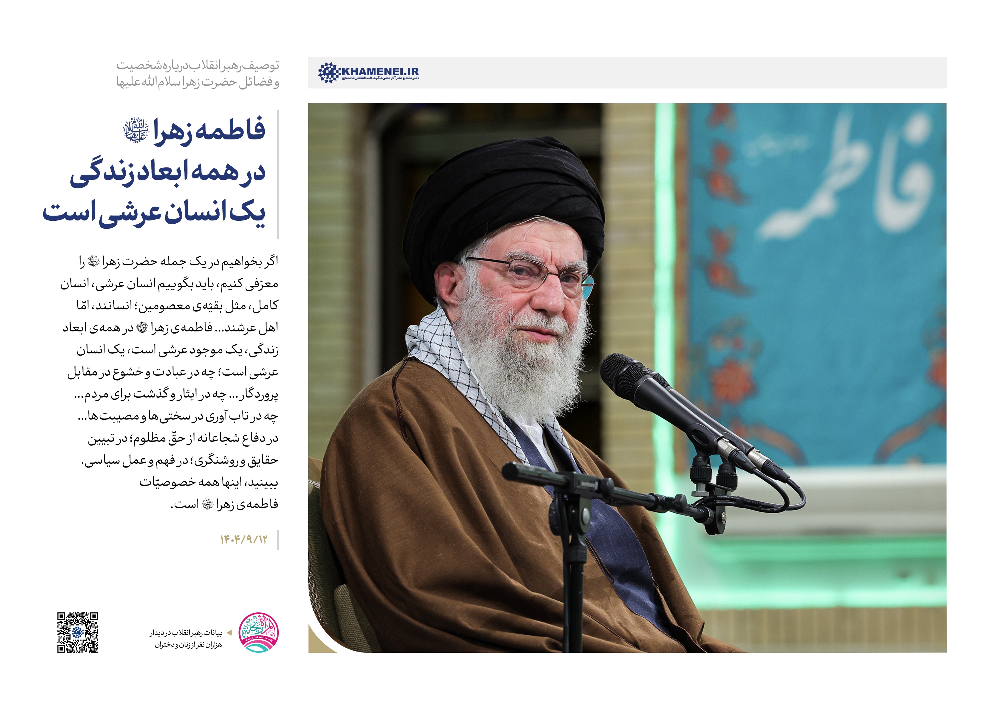 رهبر معظم انقلاب در دیدار هزاران نفر از زنان و دختران فرمودند: «حضرت فاطمه(س) در همه ابعاد زندگی، یک موجود عرشی است، یک انسان عرشی است؛ چه در عبادت و خشوع در مقابل پروردگار ــ که شنیدهاید عبادتهای ایشان را، مناجاتهای ایشان را در شبها، دعای ایشان را برای دیگران ــ چه در ایثار و گذشت برای مردم». بر اساس بیانات رهبر معظم انقلاب، در این دیدار مجموعه سخننگاشت منتشر شد.