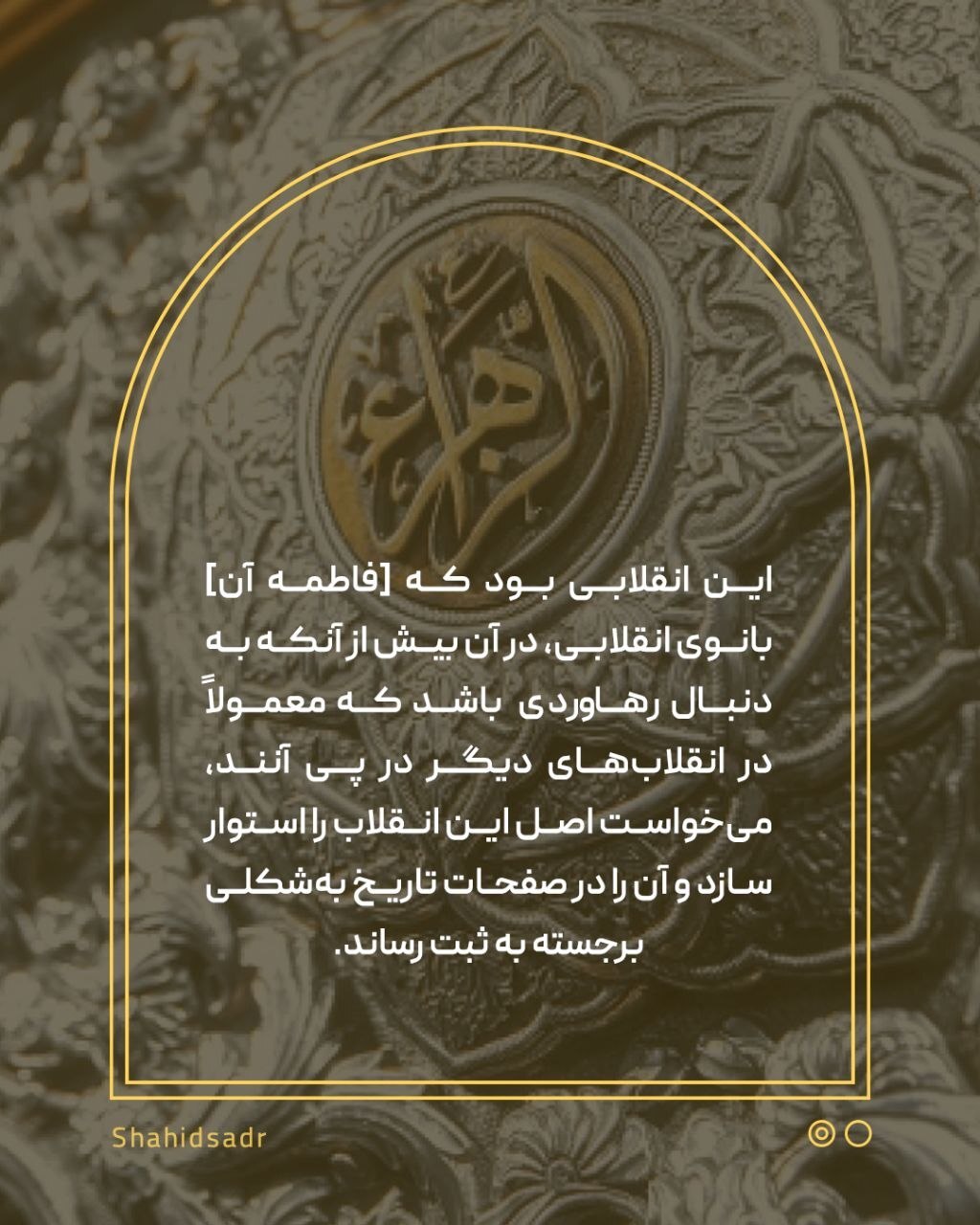 این انقلابی بود که [فاطمه سلام‌الله‌علیها آن] بانوی انقلابی، در آن بیش از آنکه به‌دنبال رهاوردی باشد که معمولاً در انقلاب‌‌های دیگر در پی آنند، می‌‌خواست اصل این انقلاب را استوار سازد و آن را در صفحات تاریخ به‌شکلی برجسته به ثبت رساند. بدین‌‌سان این انقلاب به‌‌خودی‌‌خود،‌‌ هدف مطلوب را به‌گونه کامل تحقق می‌‌بخشید و این چیزی بود که در عمل رخ داد؛ از اینجاست که هرچند به‌ظاهر این حرکت شکست خورد، آن را پیروز می‌‌شماریم. [شهید سید محمدباقر صدر، کتاب فدک در تاریخ، ص٣۴]