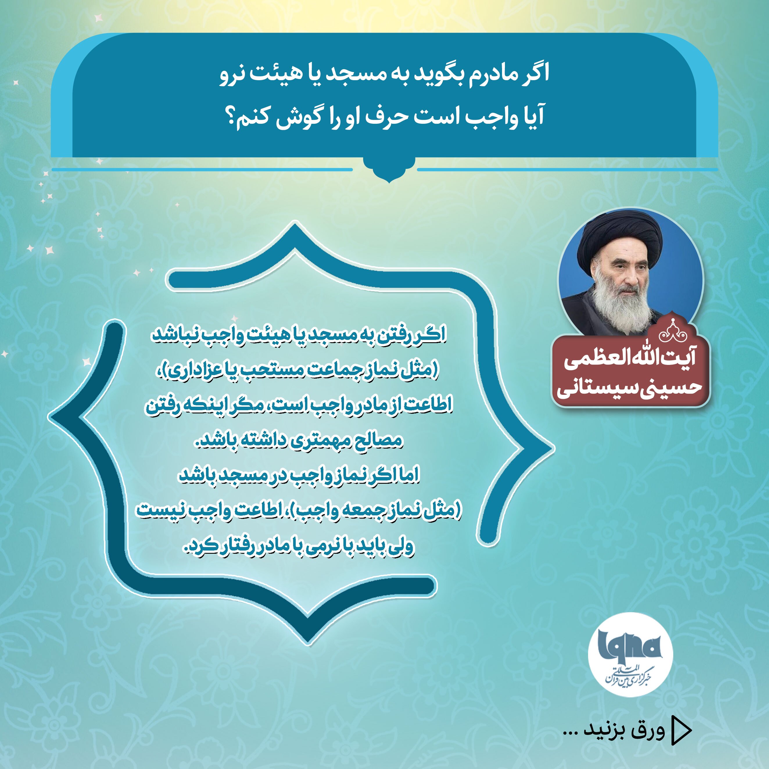 گاهی پیش میآید که پدر یا مادر از رفتن فرزند به مسجد، هیئت یا مجالس مذهبی جلوگیری میکنند. مراجع تقلید میفرمایند «شرکت در مسجد و هیئت مستحب است، اما رنجاندن پدر و مادر حرام میباشد؛ بنابراین اگر رفتن سبب ناراحتی جدیِ والدین شود، اطاعت از آنان واجب و ترک مستحب لازم است». البته اگر والدین تنها از روی سختگیری یا بدون دلیل شرعی منع کنند و ناراحتی آنها جدی و آزاردهنده نباشد، رفتن اشکالی ندارد. در نگاه فقها، حفظ احترام والدین بر بسیاری از مستحبات مقدّم است. در ادامه نظر برخی مراجع را در این باره مشاهده میکنید.
