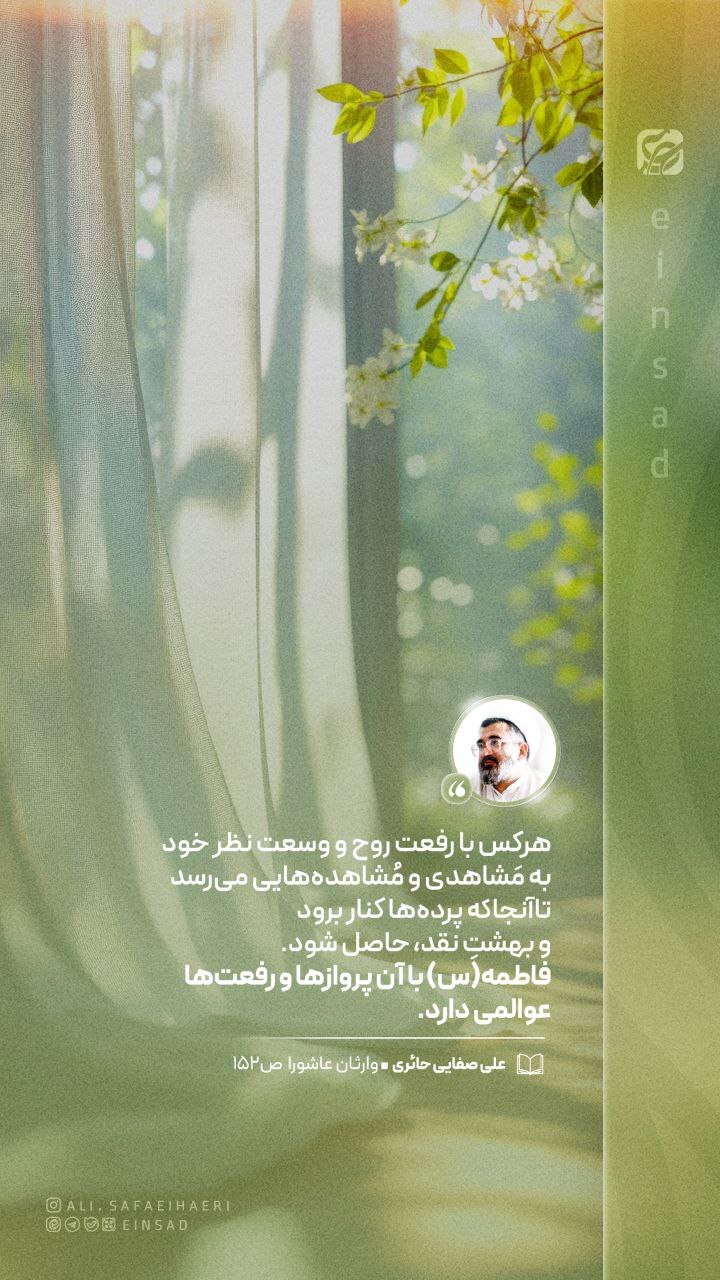 هركس با رفعت روح و وسعت نظر خود به مَشاهدى و مُشاهده‌هايى مى‌رسد تا آنجا كه پرده‌ها كنار برود و بهشت نقد حاصل شود. فاطمه‌ (س) با آن پروازها و رفعت‌ها عوالمى دارد و در اين عوالم ابتهاج‌ها و بهره‌هايى دارد. فاطمه(س) مى‌فرمايد: از دنياى شما سه چيز براى من محبوب گرديده و اين‌ها به هم مرتبط هستند؛ انس با خدا و انس با رسول خدا(ص) و بخشش در راه خدا، كه اين بخشندگى نتيجه‌ اين سرشارى انس و غناى وجودى است. آن‌جا كه سمع و بصر سرشار گرديده و در دل انس و محبت مستقر شده، ناچار در جوارح و جوانح، گذشت و انفاق قرار مى‌گيرد. [استاد علی صفایی حائری، کتاب وارثان عاشورا]