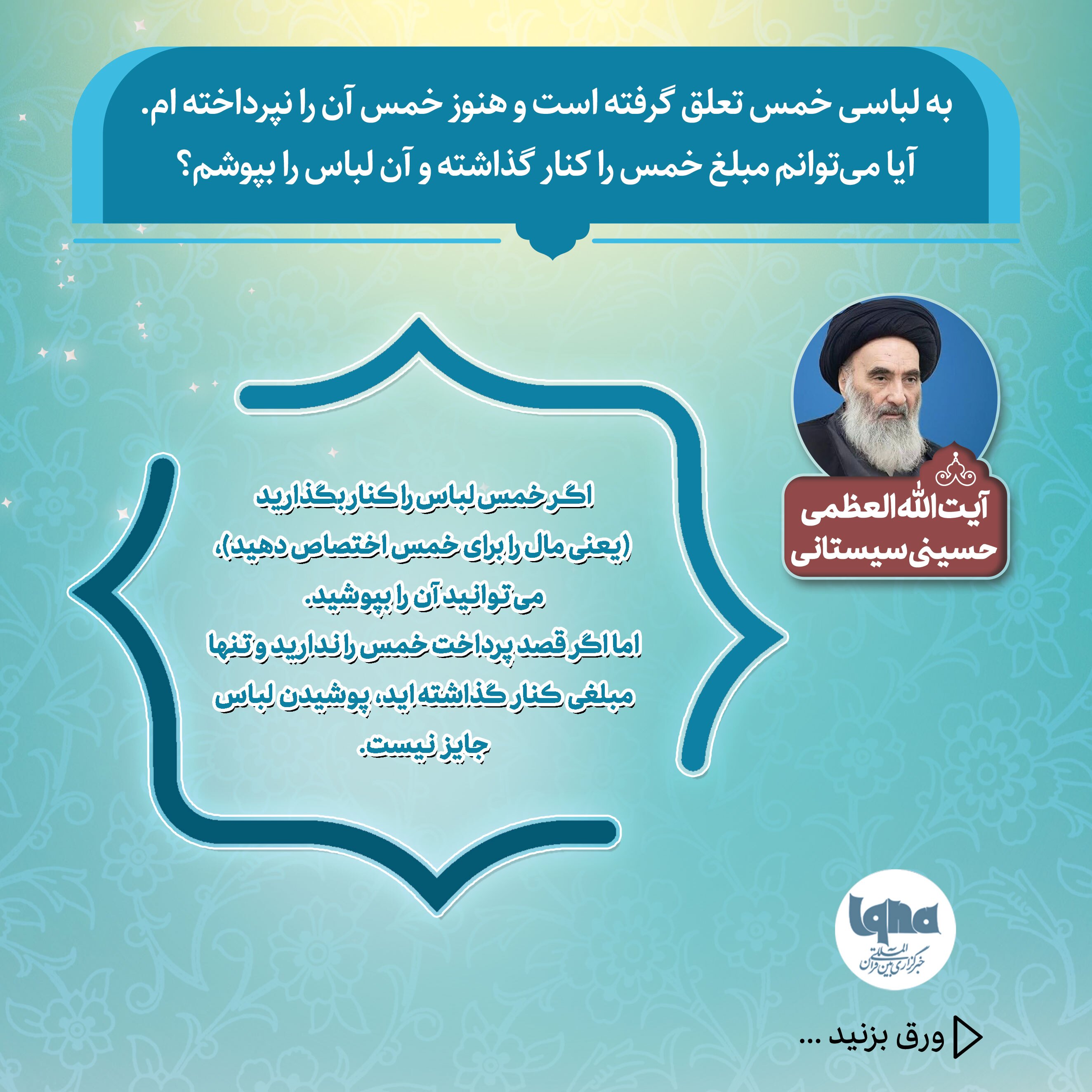 گاهی لباسی تهیه شده که خمس به آن تعلق گرفته، اما هنوز خمس آن پرداخت نشده است. مراجع تقلید میفرمایند «تا زمانی که خمس مال پرداخت نشده، تصرف در آن جایز نیست؛ حتی اگر انسان مبلغ خمس را کنار گذاشته باشد. جواز استفاده از لباس، زمانی حاصل میشود که خمس آن عملاً پرداخت یا با اجازه مرجع تقلید مصالحه شده باشد». در نگاه فقها، کنار گذاشتن پول خمس بهتنهایی، جای پرداخت واقعی آن را نمیگیرد. در ادامه دیدگاه برخی از مراجع تقلید درباره این موضوع را مرور میکنیم.