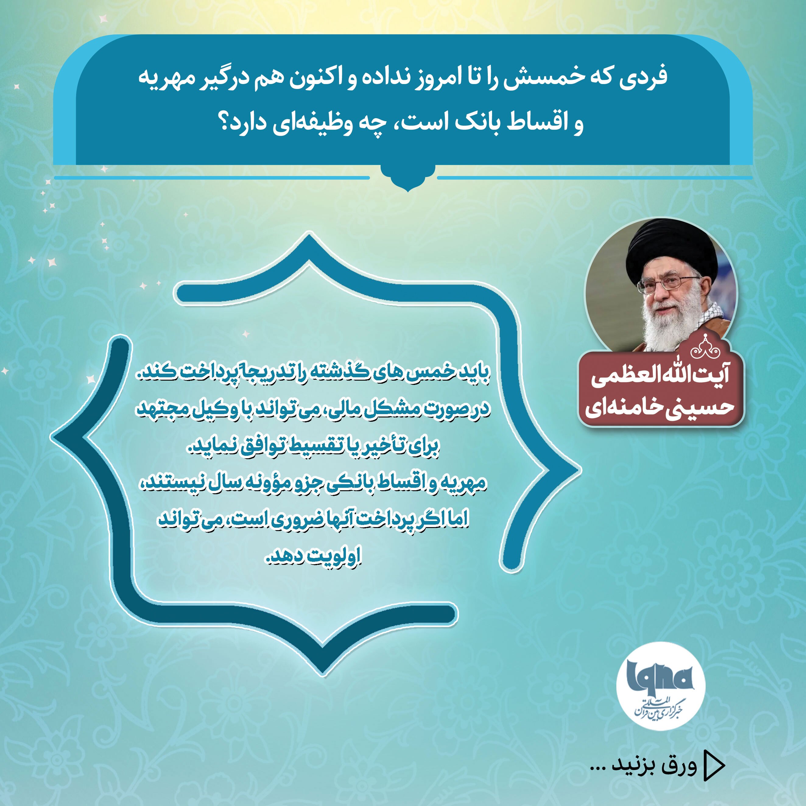گاهی فردی تا سالها خمس پرداخت نکرده و اکنون درگیر پرداخت مهریه و اقساط بانکی است. مراجع تقلید میفرمایند «اصلِ خمس، حق شرعی واجب است و ترک آن موجب بدهکاری شرعی میشود. با این حال، اگر پرداخت یکجای خمس باعث عُسر و حرج شود، میتواند با اجازه مرجع تقلید یا دفتر ایشان، خمس را تقسیط یا مصالحه کند. پرداخت بدهیهایی مانند مهریه و اقساط بانکی، مانع اصل وجوب خمس نیست، اما در نحوه پرداخت آن اثر دارد». در نگاه فقها، بهترین راه، مراجعه به دفتر مرجع و تعیین تکلیف تدریجی و منظم خمس است. در ادامه حکم شرعی برخی مراجع تقلید را درباره این موضوع مرور میکنیم.