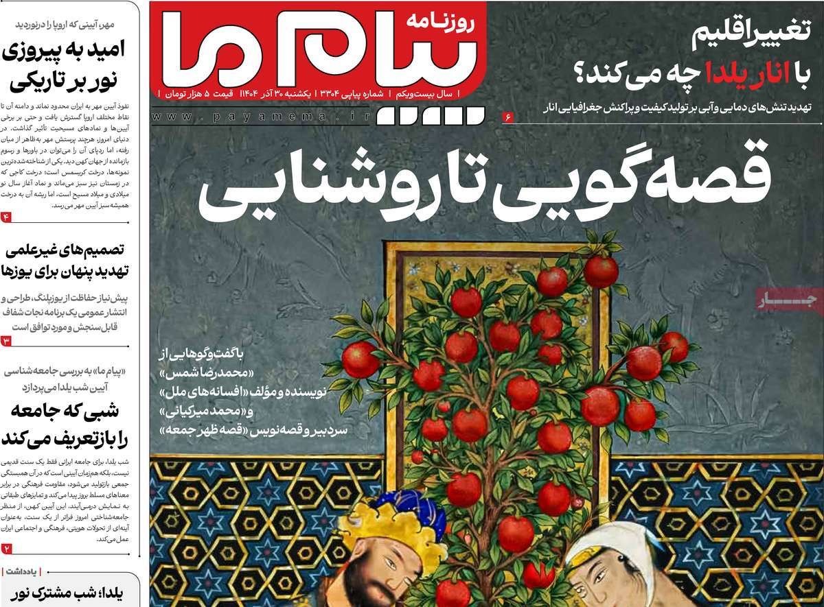 صفحه نخست روزنامههای یکشنبه ۳۰ آذر ۱۴۰۴ را که به قصهگویی تا روشنایی، یلدای مهربانی برای همدلی و گفتوگو، «ایران مرد» شعار بزرگداشت شهید سلیمانی و مهمترین رویدادهای ورزشی پرداختهاند؛ در ادامه مشاهده میکنید.