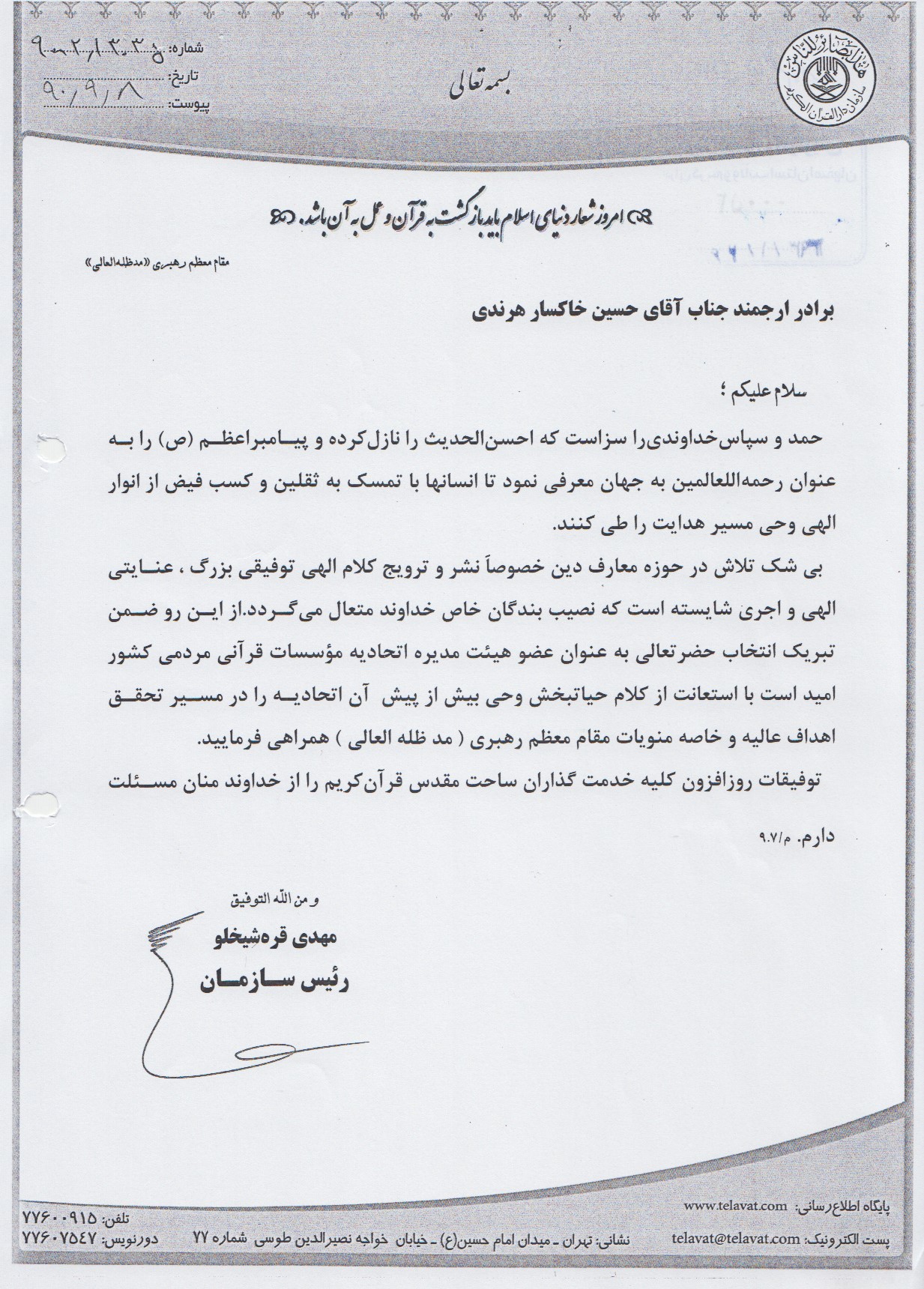 حسین خاکساریهرندی، مدیر مؤسسه مهد قرآن کریم و ولایت که در رشته الهیات در مقطع کارشناسی و رشته مدیریت کارشناسی ارشد تحصیل کرده است، بهعنوان مسئول آموزش، فرهنگی و روابط عمومی و دارالقرآنهای بنیادهای مستضعفان و جانبازان و شهید ایثارگران استانهای کرج، تهران و اصفهان و غیره به فعالیت پرداخته است و هماکنون سکاندار اتحادیه مؤسسات قرآنی ـ مردمی استان اصفهان است.