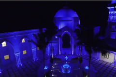 فوارههای آب با نورهای آبی، سبز و قرمز در جلوی ساختمان مسجد، زیبایی گنبد مرمرین را منعکس میکند.