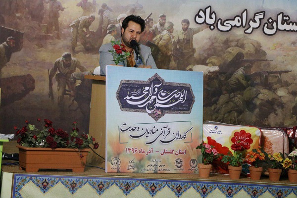 وی اذعان کرد: حضرت امام خامنهای بارها بر ضرورت حفظ و تقویت روحیه ایثار و مقاومت و گرامیداشت یاد شهدا تأکید فرمودهاند تا جایی که زنده نگه داشتن یاد و خاطره شهدا را کمتر از شهادت ندانستهاند؛ این مهم ما را بر این داشته تا با هدف تقویت روحیه ایثار و از خودگذشتگی و نیز ترویج فرهنگ شهادت و گرامیداشت یاد و نام شهدای سرافراز ایران اسلامی به ویژه شهدای استان گلستان، نسبت به اختصاص هر محفل و برنامه به نام دو شهید گرانقدر که یکی از شهدای اهل سنت و یکی نیز از شهدای شیعه نیز اقدام نموده و ضمن طراحی و ساخت المانهایی برای این امر و مزین نمودن محفل به تمثال نورانی شهدا و قرائت فرازی از وصیتنامه و زندگینامه شهدای شاخص محفل، لوح یادبودی را به خانواده معزز و محترم آن شهدا اهدا نماییم.