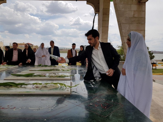 پیش از آغاز مراسم، زوجهای دانشجو در حرکتی معنوی با حضور بر سر مزار شهدای گمنام، با نثار شاخه گل، عطرافشانی و قرائت فاتحه، به مقام شامخ این عزیزان ادای احترام کردند.