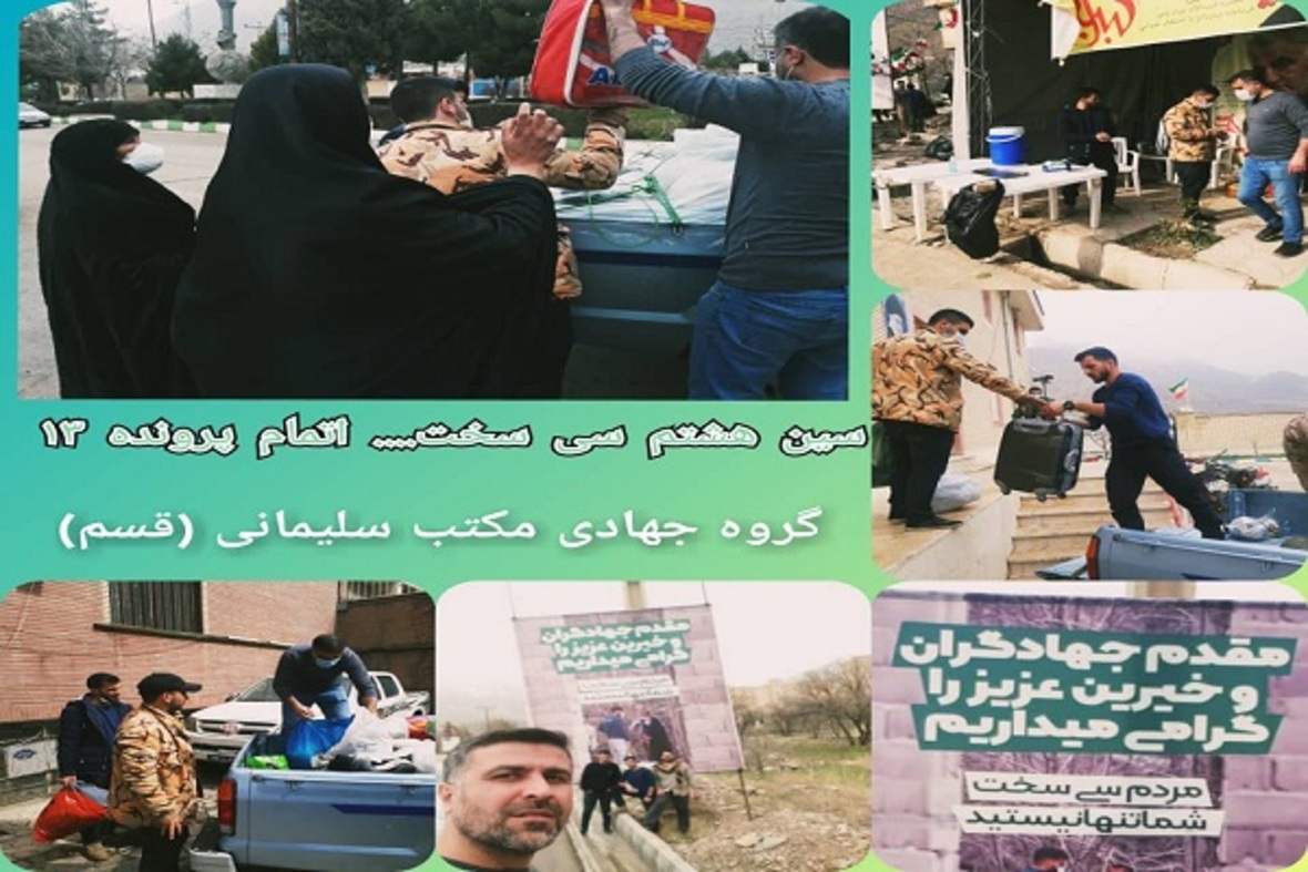 وی افزود: در سال ۱۳۹۶ تعدادی از جوانان مؤمن و انقلابی با سابقه فعالیت در حوزههای مختلف جهادی با توکل به خدا و استعانت از امام عصر(عج) گردهم آمده و با هدف خدمت به محرومان کار جهادی خود را آغاز کردند. پس از شهادت شهید حاج قاسم سلیمانی این جوانان مصممتر از قبل سوگند یاد کردند تا راه و مکتب حاج قاسم را که همان راه و مکتب انقلاب، امام و شهدا است، ادامه داده و با قدرت بیشتر در جهت همافزایی و انجام کار تشکیلاتی بر آمده از تجربیات موفق گروههای جهادی و مؤسسات مردمنهاد گروه جهادی منسجم و کارآمدتر داشته باشند لذا گروه جهادی مکتب سلیمانی (قسم) را در اسفندماه سال ۱۳۹۸ به طور رسمی تأسیس کرده تا در حد وسع، گامی هر چند کوچک در جهت ایجاد تمدن اسلامی بردارند.