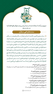 مقام معظم رهبری در دیدار رئیس و مسئولان قوه قضائیه، دربارهی قوانین و سنتهای الهی به آیاتی از سورههای یس، بقره، عنکبوت، نساء، حج، محمد، ابراهیم، شعراء، جن، آلعمران و فتح از قرآن کریم اشاره کردند که آیات و بیانات رهبر انقلاب در این دیدار در تصاویر ارائه شده، مرور میشود.