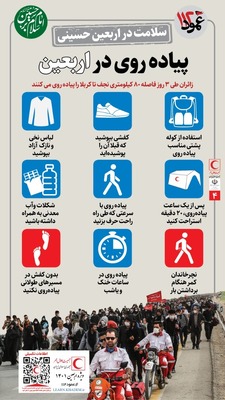 جمعیت هلال احمر کشور در راستای ارائه آموزشهای خدمات درمانی به زائران عتبات عالیات، مجموعه اینفوگرافیک «حفظ سلامت زائران» را با محوریت توصیههایی برای پیشگیری و حفظ سلامت زائران اربعین حسینی از انواع بیماریها و خطرات محتمل در مسیر پیاده روی منتشر کرد.