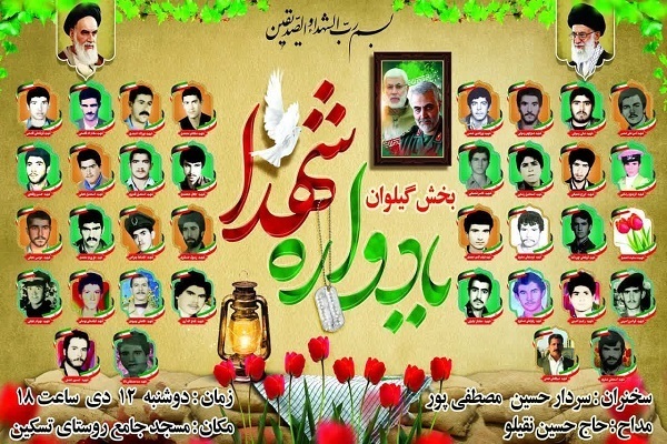 همچنین مراسم یادواره شهدای بخش گیلوان با همکاری سپاه ناحیه طارم و اداره بنیاد شهید و امور ایثارگران این شهرستان همراه با مداحی حسین نقیلو، سخنرانی سردار حسین مصطفیپور، خاطرهگویی یکی از سرداران و همرزمان شهید سردار سلیمانی، تجلیل از خانواده شهدا، اجرای گروه سرود دانشآموزی و رونمایی کتاب، روز گذشته، ساعت 18 در مسجد جامع روستای تسکین برگزار شد.