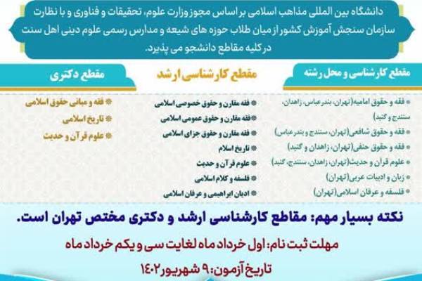 بر اساس اعلام معاونت آموزشی و تحصیلات تکمیلی دانشگاه بینالمللی مذاهب اسلامی آزمون اختصاصی پذیرش طلاب دانشگاه در ۱۶ رشته محل، ۹ شهریور ماه ۱۴۰۲ در شهرهای تهران، بندرعباس، زاهدان، سنندج و گنبد کاووس برگزار خواهد شد.