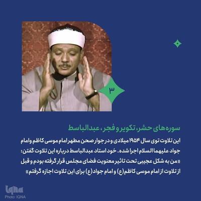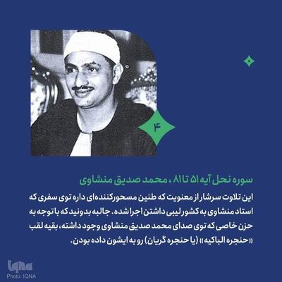 در ادامه چهار مورد از فرازهای شنیدنی تلاوتهای بهیادماندنی از اساتید جهانی تلاوت قرآن کریم همچون، عبدالباسط، مصطفی اسماعیل، محمد صدیق منشاوی و محمد اللیثی را میشنوید.