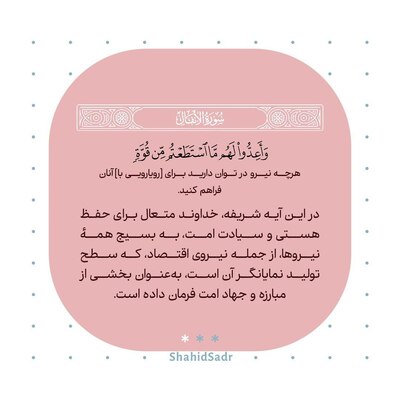 «وَ أَعِدُّوا لَهُمْ مَا اسْتَطَعْتُمْ مِنْ قُوَّةٍ» (انفال:۶) هرچه نیرو در توان دارید براى [رويارويى‏ با] آنان فراهم كنيد. در اين آيه شريفه، خداوند متعال براى حفظ هستى و سيادت امت، به بسيج همه نيروها، از جمله نيروى اقتصاد، كه سطح توليد نمايانگر آن است، به‌‏عنوان بخشى از مبارزه و جهاد امت فرمان داده است. در اينجا، اهميت اقتصاد اسلامى به‌‏عنوان شيوه‌ای اقتصادى آشكار مى‌شود؛ شيوه‌‏اى كه قادر است از خلق‌وخوى انسانِ جهانِ اسلامى بهره جويد و آن را به نيروى بزرگ حركت‌‏آفرين و سازنده در فرايند رشد، و عاملى مهم در توفيق يک برنامه درست براى زندگى اقتصادى تبديل نمايد. اگر نظام اسلامى را برگزينيم، از اين خلق‌وخو بهره خواهيم جست و خواهيم توانست آن را در مبارزه بر ضد عقب‏‌ماندگى، عامل قدرت قرار دهيم؛ به‌‏عكس آن‏كه شيوه‌‏هاى اقتصادى ديگرى را انتخاب كنيم كه از نظر روحى و تاريخى با زمينه اخلاقى ديگرى پيوند دارند.