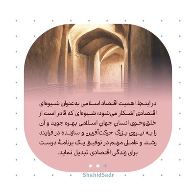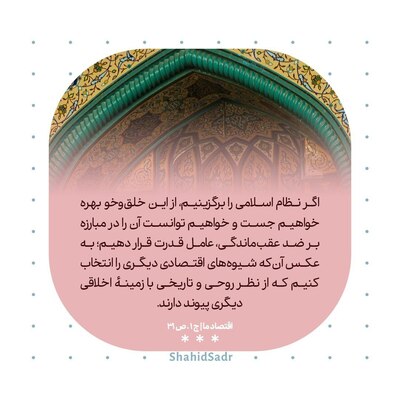 اگر نظام اسلامى را برگزينيم، از اين خلق‌وخو بهره خواهيم جست و خواهيم توانست آن را در مبارزه بر ضد عقب‏‌ماندگى، عامل قدرت قرار دهيم؛ به‌‏عكس آن‏كه شيوه‌‏هاى اقتصادى ديگرى را انتخاب كنيم كه از نظر روحى و تاريخى با زمينه اخلاقى ديگرى پيوند دارند. [آیت‌الله محمدباقر صدر، کتاب اقتصاد ما، جلد ١، صفحه ٣١]