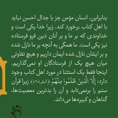 معنای اسلام در قرآن کریم، با اصطلاح شایع «اسلام» نزد مردم تفاوت دارد. اسلام نزد مردم یعنی دین حضرت محمد(ص). اما اسلام در قرآن کریم دین خداوند و به معنای تسلیم خداوند بودن است. به همین علت، دعوت همه انبیا، دعوت حضرت آدم و نوح و ابراهیم و موسی و عیسی و محمد، همه در قرآن کریم «اسلام» نامیده شده است. بنابراین انسان مؤمن جز با جدال احسن نباید با اهل کتاب برخورد کند؛ زیرا خدا یکی است و خداوندی که بر ما و بر آنان دین فرو فرستاده نیز یکی است. [امام موسی صدر، کتاب «حدیث سحرگاهان: گفتارهای تفسیری»، بند ۲۱۹ و ۲۲۰]