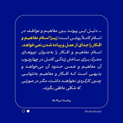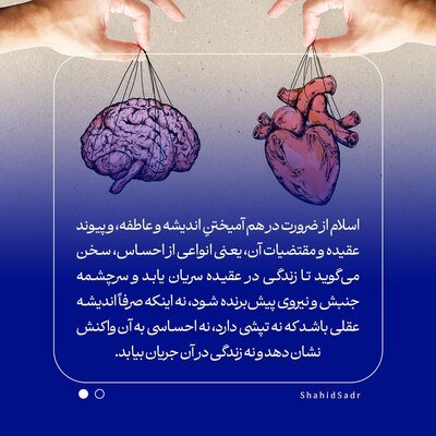 اسلام از ضرورت درهم آمیختنِ اندیشه و عاطفه، و پیوند عقیده و مقتضیات آن، یعنی انواعی از احساس، سخن میگوید تا زندگی در عقیده سریان یابد و سرچشمه جنبش و نیروی پیشبرنده شود، نه اینکه صرفاً اندیشه عقلی باشد که نه تپشی دارد، نه احساسی به آن واکنش نشان دهد و نه زندگی در آن جریان بیابد. دلیل این پیوند بین مفاهیم و عواطف در اسلام کاملاً روشن است ؛ زیرا اسلام مفاهیم و افکار را جدای از عمل و پیاده شدن نمیخواهد. [علامه صدر، کتاب رسالت ما، صفحه ١١۴-١١۵]