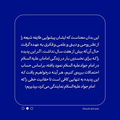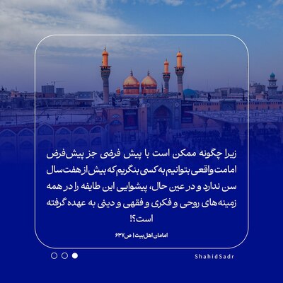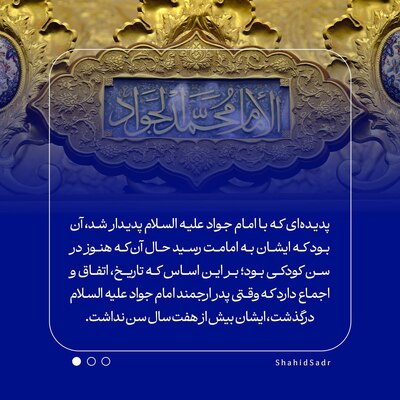 پدیده‌ای که با امام جواد(ع) پدیدار شد، آن بود که ایشان به امامت رسید حال آنکه هنوز در سن کودکی بود؛ بر این اساس که تاریخ، اتفاق و اجماع دارد که وقتی پدر ارجمند امام جواد(ع) درگذشت، ایشان بیش از هفت سال سن نداشت. این بدان معناست که ایشان پیشوایی طایفه شیعه را از نظر روحی و دینی و علمی و فکری به عهده گرفت حال آن‌که بیش از هفت سال نداشت. اگر این پدیده را که برای نخستین بار در زندگی امامان(ع) در امام جواد‌(ع) نمود یافته، بر‌اساس حساب احتمالات بررسی کنیم، هر آینه درخواهیم یافت که این پدیده به‌تنهایی کافی است تا حقانیت خطی را که امام جواد(ع) نمایندگی می‌کرد، بپذیریم. [علامه محمدباقر صدر، کتاب امامان اهل‌بیت، صفحه ۶٣٧]