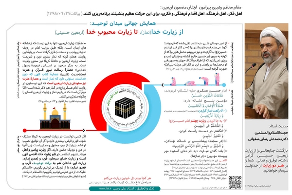 یکی از مسئولان فرهنگی ای گروه صنعتی بر مبنای ارتقای مضمون اربعین که از تأکیدات مقام معظم رهبری است، اقدام به پژوهش و انتشار اینفوگرافیک در موضوعات مختلف میکند. (اینفوگرافیک جایگاه زیارت اربعین) او در گام بعدی برای افزایش ضریب نفوذ محتوای ارائه شده، تصویر فرد را به همراه پیام خیر مقدم بازگشت او از زیارت، در کنار تصویر اینفوگرافیک بر روی تابلوی کوچک چوبی چاپ کرده و به هر کدام از آنان در بین نماز یا با حضور در محل خدمت و ... با مصافحه و تکریم زائر تحویل میدهد.