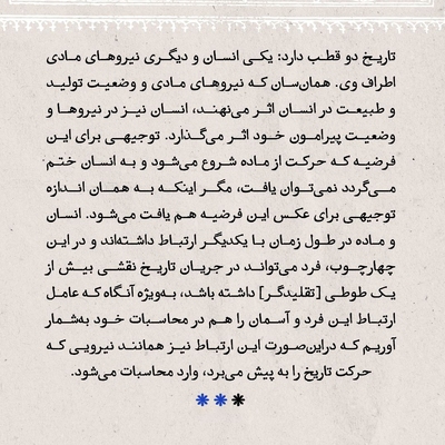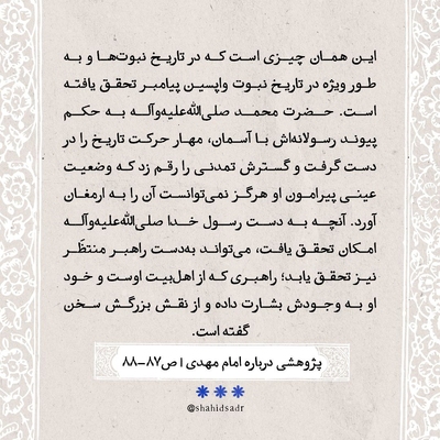 حضرت محمد(ص) به حکم پیوند رسولانهاش با آسمان، مهار حرکت تاریخ را در دست گرفت و گسترش تمدنی را رقم زد که وضعیت عینی پیرامون او هرگز نمیتوانست آن را به ارمغان آورد. آنچه به دست رسول خدا(ص) امکان تحقق یافت، میتواند بهدست راهبر منتظَر نیز تحقق یابد؛ راهبری که از اهلبیت(ع) اوست و خود او به وجودش بشارت داده و از نقش بزرگش سخن گفته است. [پژوهشی درباره امام مهدی(عج)، ص٨٧-٨٨]