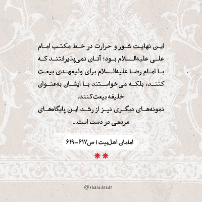 وقتی فضلبنسهل فرستادگان خود را سوی کوفه راهی کرد تا برای وليعهدی علیبنموسی(ع) بيعت بگيرند، کوفیان سر باز زدند و گفتند: «ما با علیبنموسی(ع) برای خلافت بيعت میکنيم، نه برای وليعهدی». اين نهايت شور و حرارت در خط مکتب امام علی(ع) بود؛ آنان نمیپذيرفتند که با امام رضا(ع) برای وليعهدی بيعت کنند، بلکه میخواستند با ايشان بهعنوان خليفه بيعت کنند. نمونههای ديگری نيز از رشد اين پايگاههای مردمی در دست است… [شهید محمدباقر صدر، کتاب امامان اهلبیت(ع)، صفحه ۶١٧-۶١٩]