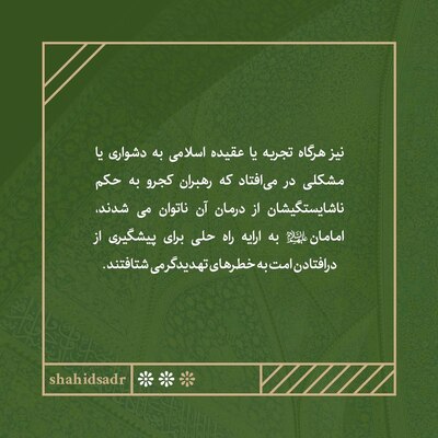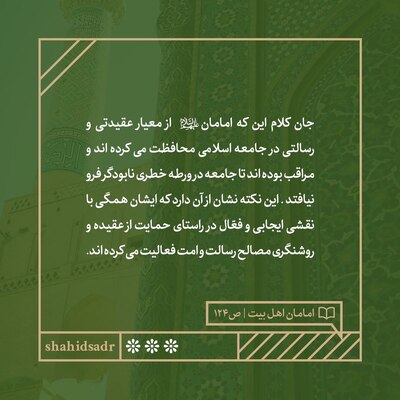 امامان(ع) از معيار عقيدتی و رسالتی در جامعه اسلامی محافظت می‌کرده‌اند و مراقب بوده‌اند تا جامعه در ورطه خطری نابودگر فرو نيافتد. اين نکته نشان از آن دارد که ايشان همگی با نقشی ايجابی و فعّال در راستای حمايت از عقيده و روشنگری مصالح رسالت و امت فعاليت می‌کرده‌اند. [شهید سید محمدباقر صدر؛ کتاب امامان اهل بیت(ع)، صفحه ۱۲۴]