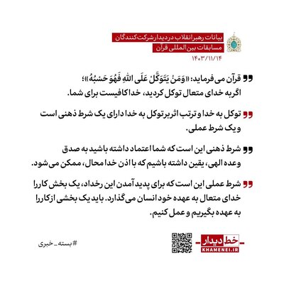 مجموعهای از بیانات رهبر معظم انقلاب در دیدار شرکتکنندگان در چهل و یکمین مسابقات بینالمللی قرآن ایران، در قالب فتوتیتر منتشر شد. در این مجموعه بیانات ایشان که درباره قرآن کریم، راهحل مشکلات، ملت ایران و غزه ایراد شده است، مرور میشود.