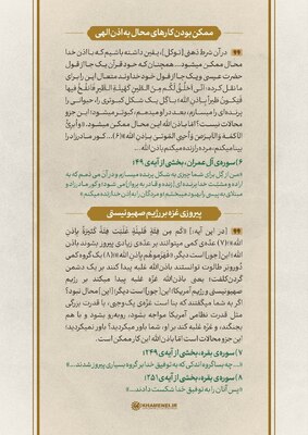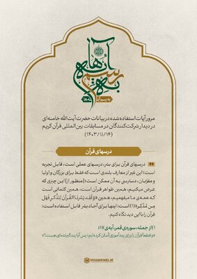 رهبر معظم انقلاب در دیدار شرکتکنندگان در مسابقات بینالمللی قرآن کریم که در ۱۴ بهمن ماه انجام شد، پیرامون درسهای قرآن، توکل بر خدا، ممکن بودن کارهای محال، پیروزی غزه و تحقق وعده الهی به آیاتی از سورههای قمر، طلاق، نساء، فتح، حج، آل عمران، بقره، طه، انفال و مائده اشاره کردند که این آیات و بیانات رهبر معظم انقلاب درباره این آیات ارائه میشود.