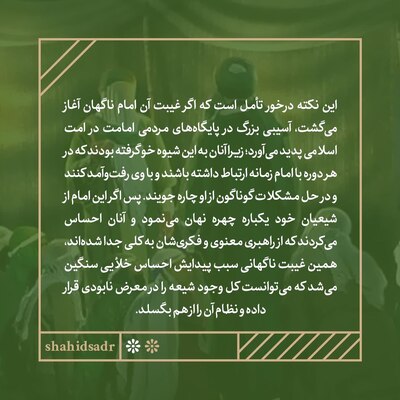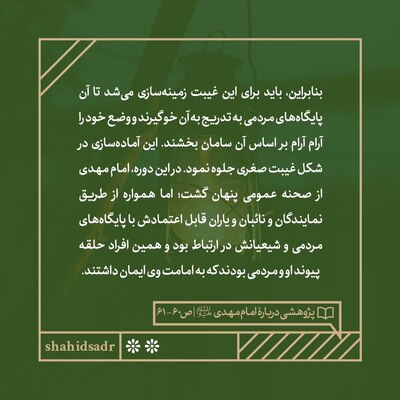 این نکته درخور تأمل است که اگر غیبت آن امام ناگهان آغاز میگشت، آسیبی بزرگ در پایگاههای مردمی امامت در امت اسلامی پدید میآورد؛ زیرا آنان به این شیوه خو گرفته بودند که در هر دوره با امام زمانه ارتباط داشته باشند و با وی رفتوآمد کنند و در حل مشکلات گوناگون از او چاره جویند. پس اگر این امام از شیعیان خود یکباره چهره نهان مینمود و آنان احساس میکردند که از راهبری معنوی و فکریشان به کلی جدا شدهاند، همین غیبت ناگهانی سبب پیدایش احساس خلأیی سنگین میشد که میتوانست کل وجود شیعه را در معرض نابودی قرار داده و نظام آن را از هم بگسلد. بنابراین، باید برای این غیبت زمینهسازی میشد تا آن پایگاههای مردمی به تدریج به آن خو گیرند و وضع خود را آرام آرام بر اساس آن سامان بخشند. [شهید سید محمدباقر صدر، کتاب پژوهشی درباره امام مهدی(عج)، صفحه ۶۰-۶۱]