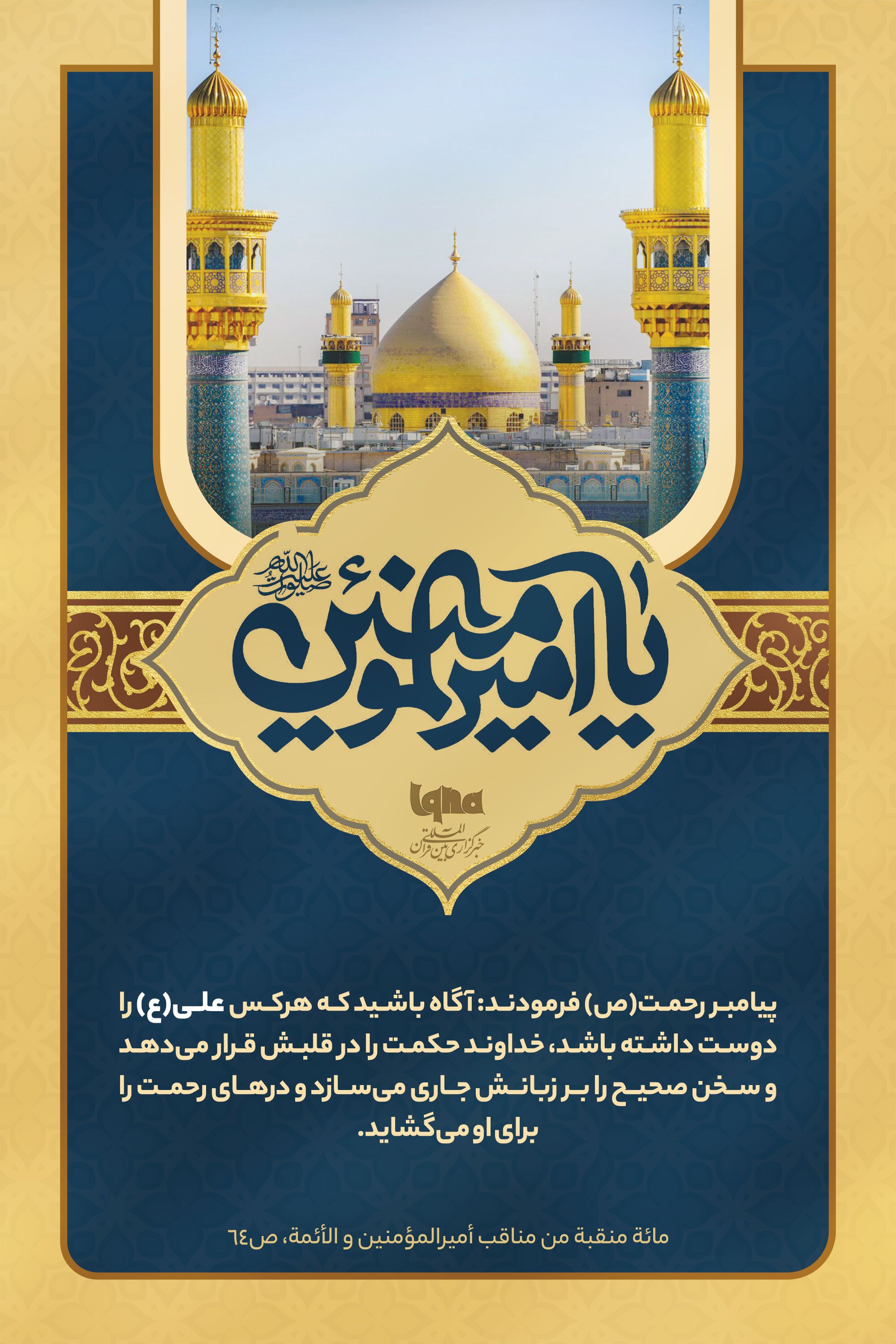 پیامبر رحمت(ص) فرمودند: آگاه باشید که هرکس علی(ع) را دوست داشته باشد، خداوند حکمت را در قلبش قرار می‌دهد و سخن صحیح را بر زبانش جاری می‌سازد و درهای رحمت را برای او می‌گشاید. [مائة منقبة من مناقب أميرالمؤمنين و الأئمة، ص۶۴]