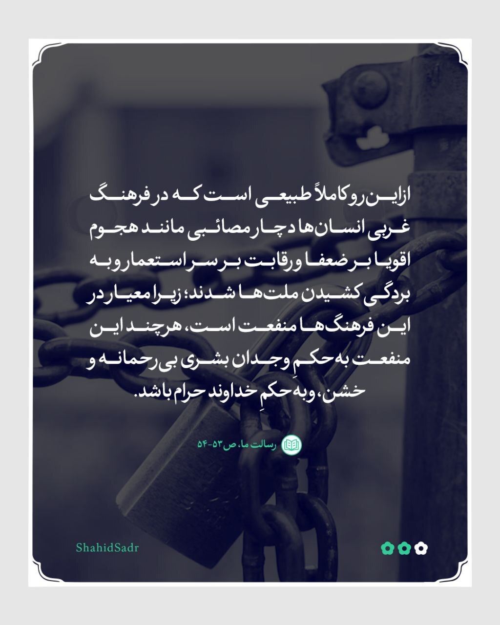 فرهنگ اسلامی بر پایه پیوند دادن زندگی انسان به آفریننده حکیم استوار است که این زندگی را خلق و بهترین نظام را برای آن وضع کرده است و باور دارد که سعادت این زندگی جز با تطبیق نظام الهی بر آن بهدست نمیآید و هدف این زندگی باید «رضای خداوند» باشد که با برپایی جامعهای عادل بر طبق نظام الهی محقق میشود. همه فرهنگهای دیگر نقطه مقابل فرهنگ اسلامی هستند؛ زیرا این فرهنگها زندگی را بر پایه جدایی زندگی از دین بنا میکنند و دین را از جایگاه اصلی خود در زیربنای اجتماعی زندگی کنار میزنند. این فرهنگها سعادت را تنها «کسب لذت و منفعت» معرفی میکنند و هدف هر انسانی را «دستیابی به بیشترین مقدار ممکن از لذت و منفعت» قرار میدهند. [شهید سید محمدباقر صدر، کتاب رسالت ما، ص۵٣-۵۴]