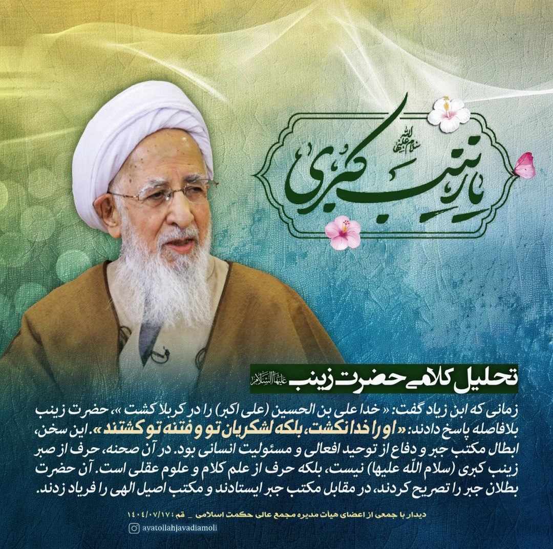 زمانی که ابن زیاد گفت: «خدا علی بن الحسین (علی اکبر) را در کربلا کشت» حضرت زینب(س) بلافاصله پاسخ دادند: «او را خدا نکشت، بلکه لشکریان تو و فتنه تو کشتند». این سخن، ابطال مکتب جبر و دفاع از توحید افعالی و مسئولیت انسانی بود. در آن صحنه، حرف از صبر زینب کبری(س) نیست، بلکه حرف از علم کلام و علوم عقلی است. آن حضرت بطلان جبر را تصریح کردند، در مقابل مکتب جبر ایستادند و مکتب اصیل الهی را فریاد زدند. [آیتالله جوادی آملی؛١٤٠٤/٠٧/١٧]