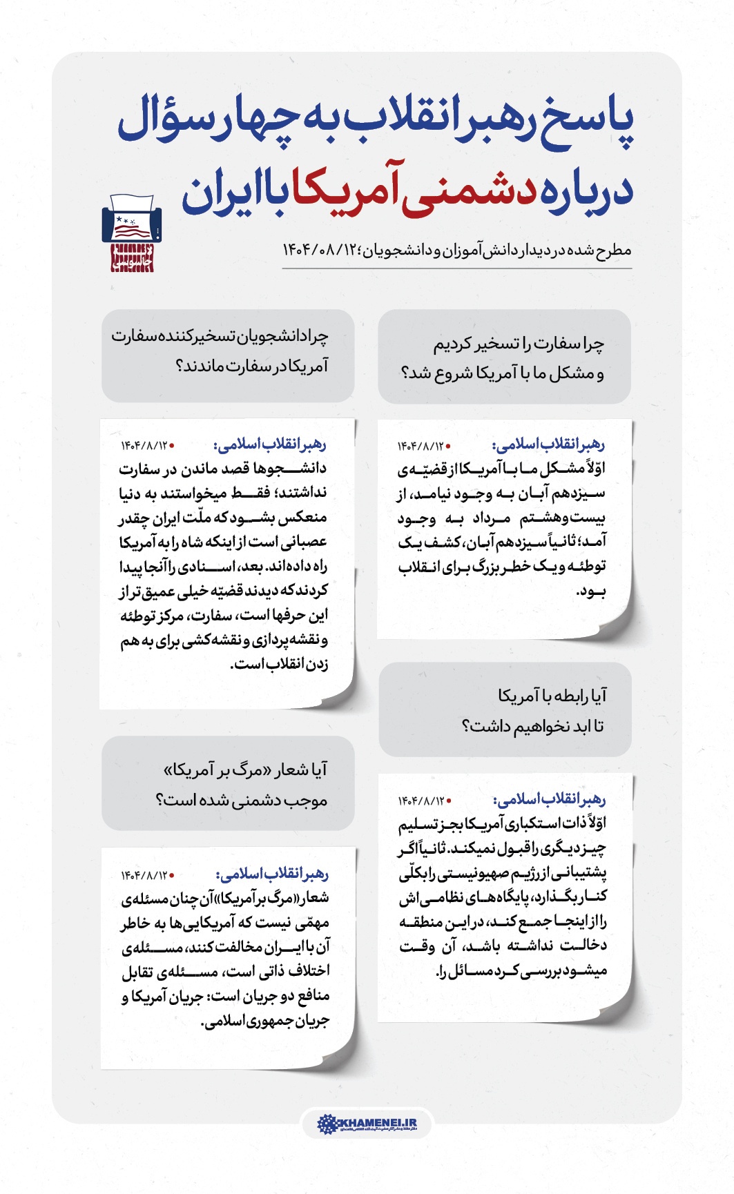 اطلاعنگاشت | پاسخ رهبر انقلاب به چهار سؤال درباره دشمنی آمریکا با ایران