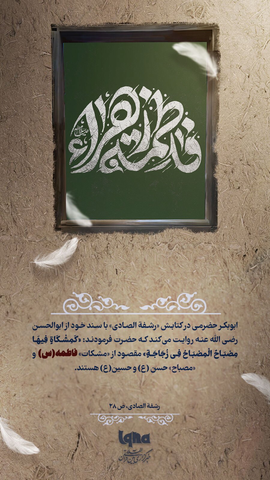 ابوبکر حضرمی در کتابش «رشفة الصادی» با سند خود از ابوالحسن رضی الله عنه روایت می‌کند که حضرت فرمودند: «کَمِشْکَاةٍ فِیهَا مِصْبَاحٌ الْمِصْبَاحُ فِی زُجَاجَةٍ» مقصود از «مشکات» فاطمه(س) و «مصباح» حسن(ع) و حسین(ع) هستند. [رشفة الصادی، ص ۲۸]