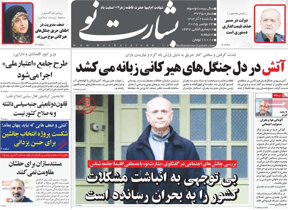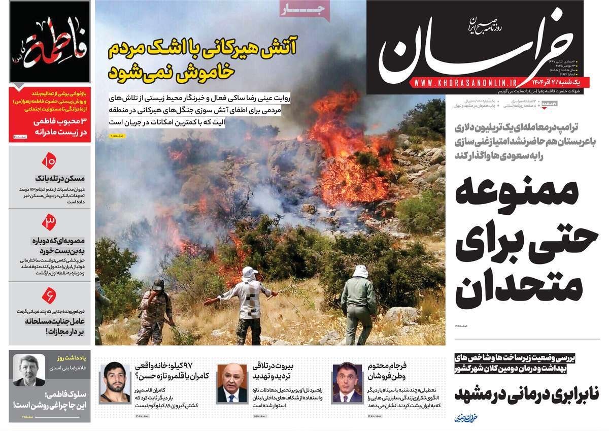 صفحه نخست روزنامههای یکشنبه ۲ آذر ۱۴۰۴ را که به پایتخت در محاصره آلایندهها، فاطمیه ایران، آتش به جان میراث جهانی «هیرکانی» و مهمترین رویدادهای ورزشی پرداختهاند؛ در ادامه مشاهده میکنید.