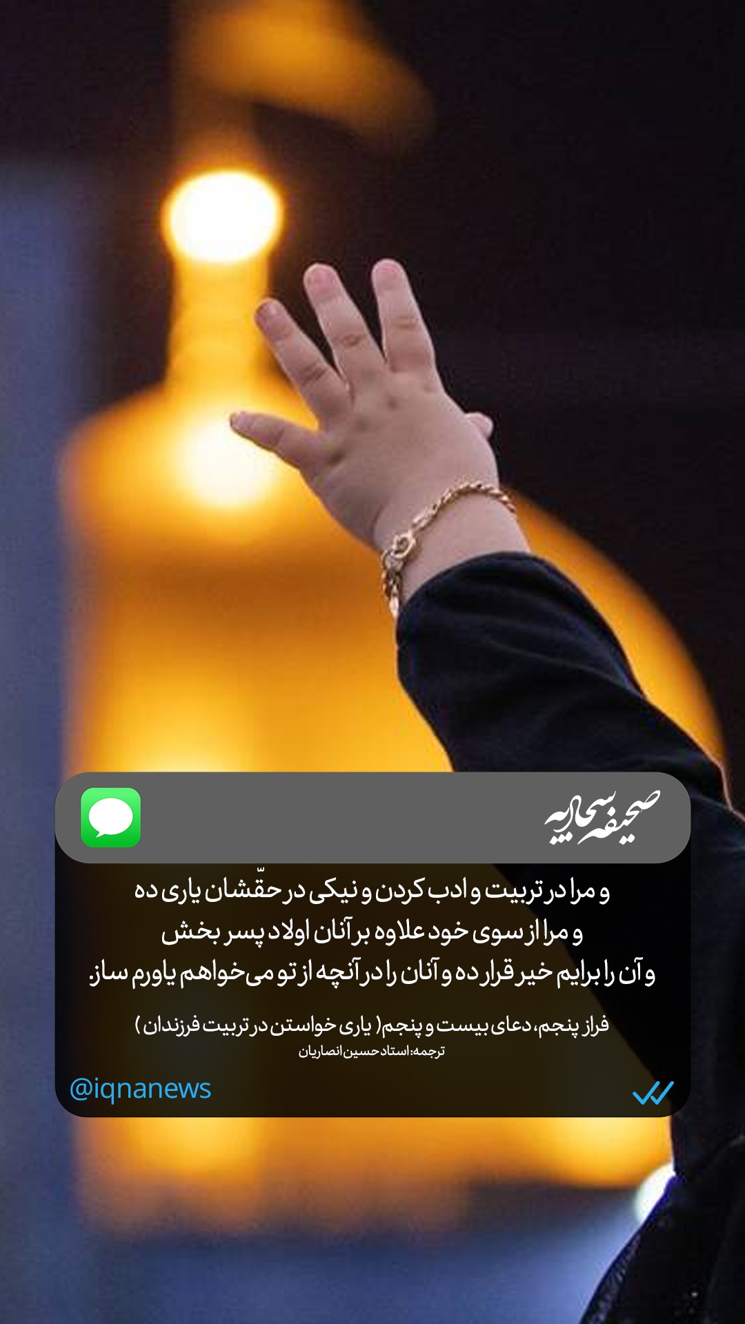 «و مرا در تربیت و ادب کردن و نیکی در حقشان یاری ده و در آنچه از تو میخواهم یاورم ساز». صحیفه سجادیه، مرواریدی درخشان در دریای ادب و عرفان اسلامی است. این کتاب ارزشمند، مجموعهای از دعاها و مناجات امام سجاد(ع) است که قلبهای مشتاق را به سوی معبود میکشاند. هر برگ از این صحیفه، آینهای است که جمال الهی را به تصویر میکشد و روح را صیقل میدهد و انسان را به سوی کمال و رستگاری هدایت میکند. ایکنا به منظور کاربرد عملی این اثر ادبی و هنری در زندگی، بخشهایی از دعاهای صحیفه سجادیه را در قالب تصویر منتشر میکند و مخاطبان را به دنیایی از معنا و معرفت میبرد.