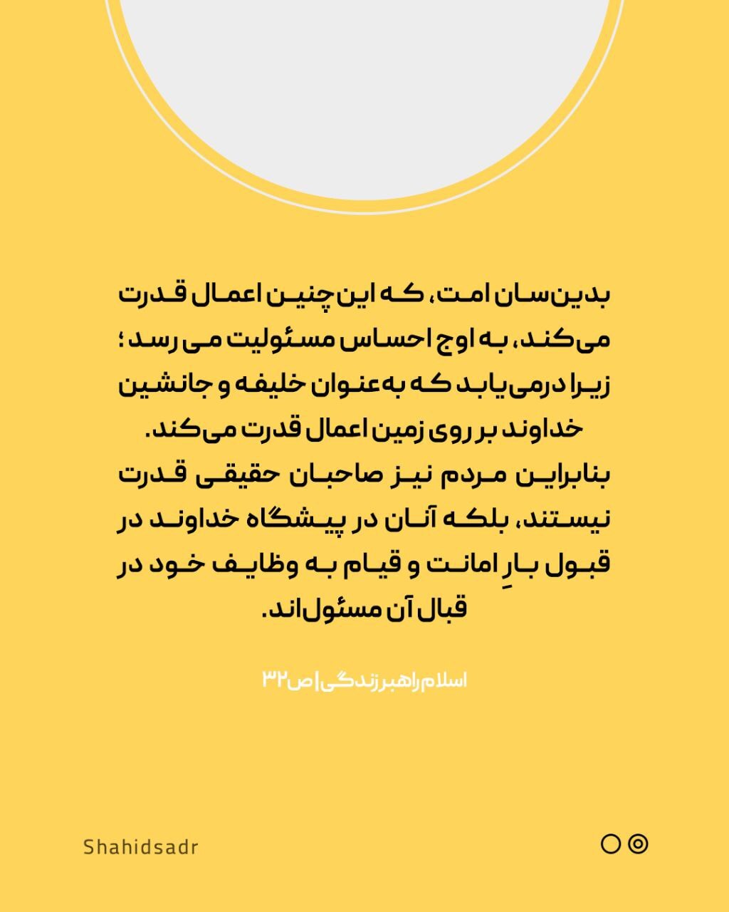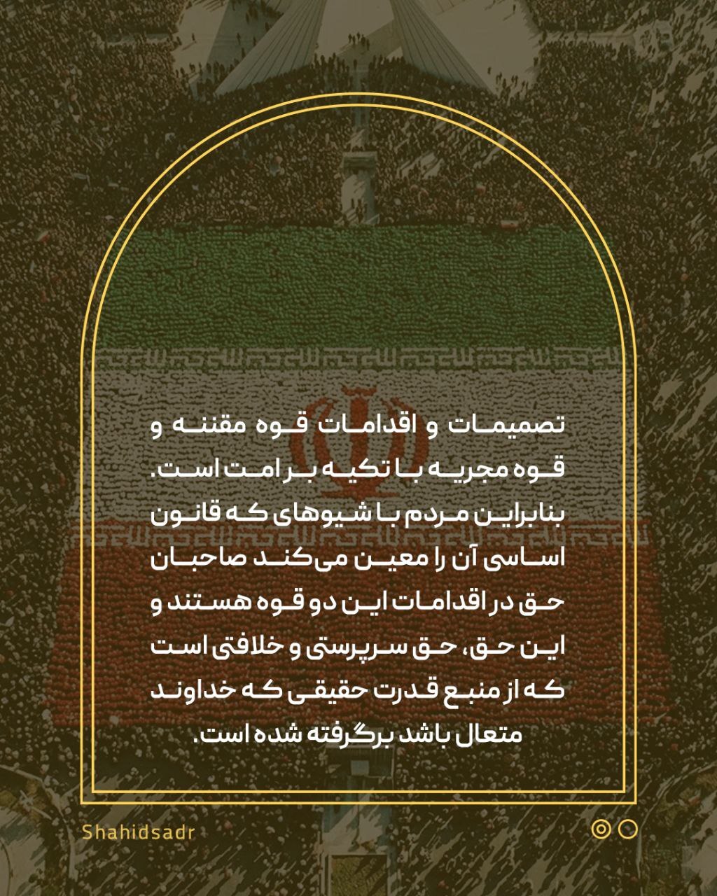 تصمیمات و اقدامات قوه مقننه و قوه مجریه با تکیه بر امت است. بنابراین مردم با شیوههایی که قانون اساسی آن را معین میکند صاحبان حق در اقدامات این دو قوه هستند و این حق، حق سرپرستی و خلافتی است که از منبع قدرت حقیقی که خداوند متعال باشد برگرفته شده است. بدینسان امت، که اینچنین اعمال قدرت میکند، به اوج احساس مسئولیت میرسد؛ زیرا درمییابد که بهعنوان خلیفه و جانشین خداوند بر روی زمین اعمال قدرت میکند. بنابراین مردم نیز صاحبان حقیقی قدرت نیستند، بلکه آنان در پیشگاه خداوند در قبول بارِ امانت و قیام به وظایف خود در قبال آن مسئولاند. [شهید سید محمدباقر صدر، اسلام راهبر زندگی، ص٣٢]