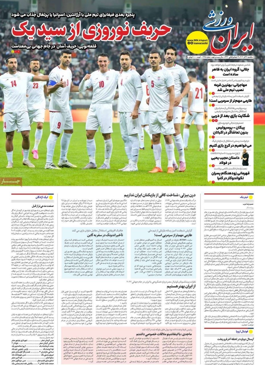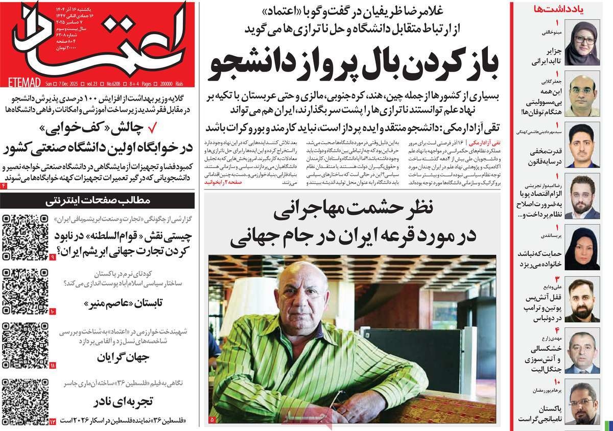 صفحه نخست روزنامههای یکشنبه ۱۶ آذر ۱۴۰۴ را که به باز کردن بال پرواز دانشجو، آب خلیج فارس به اصفهان رسید، قطار امیدوافتخار و مهمترین رویدادهای ورزشی پرداختهاند؛ در ادامه مشاهده میکنید.
