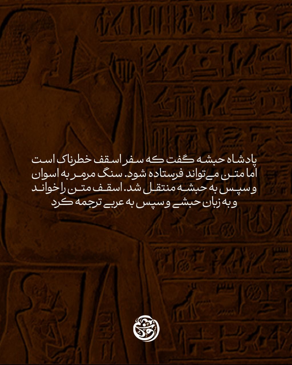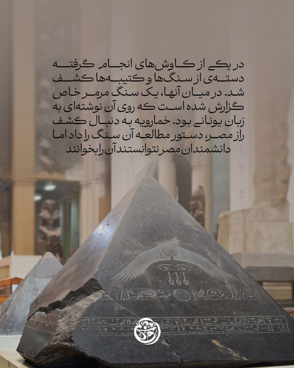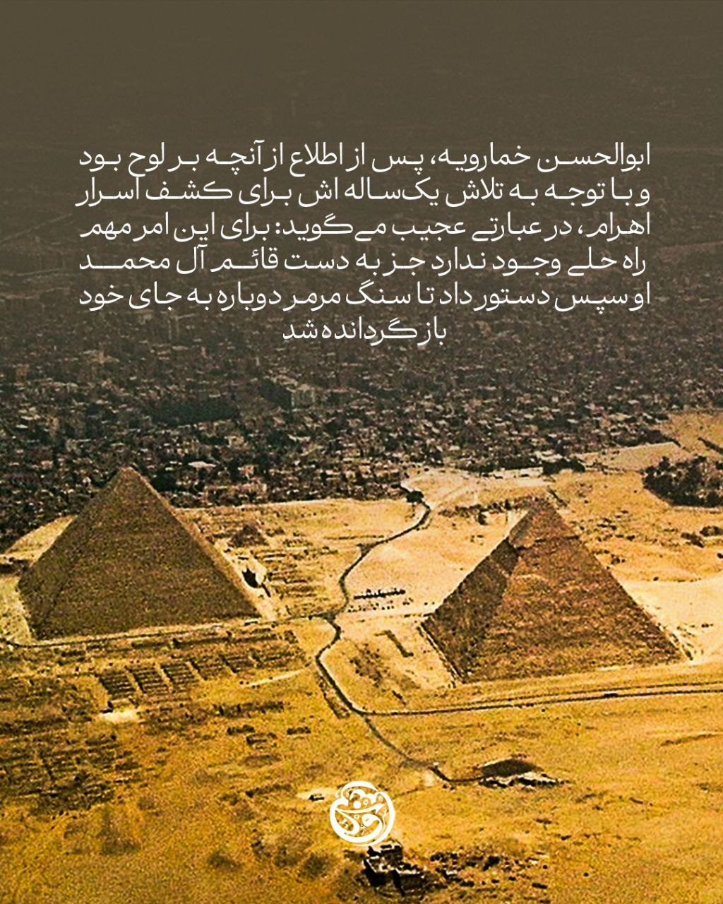 ابوالحسن خمارویه بن احمد بن طولون از حاکمان عباسی دستور داد تا هزار کارگر اهرام مصر را کاوش کنند تا راز آن را کشف نماید. در یکی از کاوشهای انجام گرفته دستهای از سنگها و کتیبهها کشف شد. در میان آنها، یک سنگ مرمر خاص گزارش شده است که روی آن نوشتهای به زبان یونانی بود. ابوالحسن خمارویه، پس از اطلاع از آنچه بر لوح بود و با توجه به تلاش یکسالهاش برای کشف اسرار اهرام، در عبارتی عجیب میگوید: برای این امر مهم راه حلی وجود ندارد جز به دست قائم آل محمد(عج)؛ او سپس دستور داد تا سنگ مرمر دوباره به جای خود باز گردانده شد.