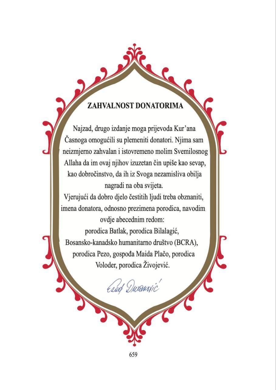 دوراکوویچ که از شخصیتهای نخبه و برجسته بوشنیاک(مسلمان) منطقه بالکان است، در پایان گفت: «امیدوارم با استقبال مثبتی روبرو شوم و خوشحالم که توانستم ویرایش دوم و اصلاحشده آن را قبل از رفتن به دنیای دیگر به پایان برسانم.»