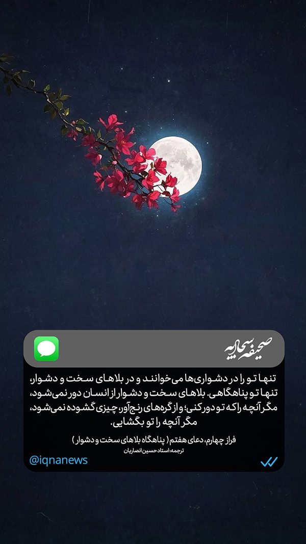 «بلاهای سخت و دشوار از انسان دور نمی‌شود مگر آنچه را که تو دور کنی». صحیفه سجادیه، مرواریدی درخشان در دریای ادب و عرفان اسلامی است. این کتاب ارزشمند، مجموعه‌ای از دعاها و مناجات امام سجاد(ع) است که قلب‌های مشتاق را به سوی معبود می‌کشاند. هر برگ از این صحیفه، آینه‌ای است که جمال الهی را به تصویر می‌کشد و روح را صیقل می‌دهد و انسان را به سوی کمال و رستگاری هدایت می‌کند. ایکنا به منظور کاربرد عملی این اثر ادبی و هنری در زندگی، بخش‌هایی از دعاهای صحیفه سجادیه را در قالب تصویر منتشر می‌کند و مخاطبان را به دنیایی از معنا و معرفت می‌برد.