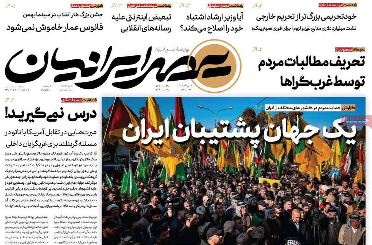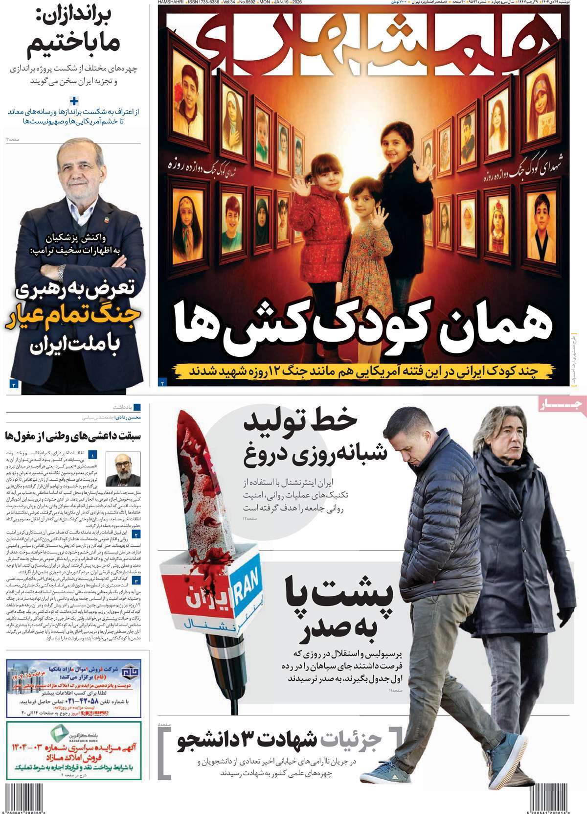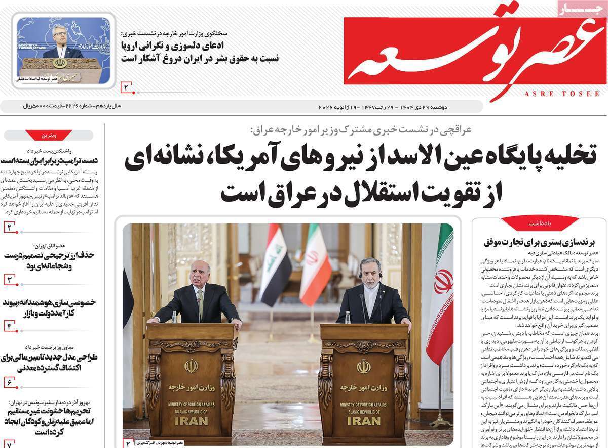 صفحات نخست روزنامههای دوشنبه ۲۹ دی ۱۴۰۴ را که به موضوعاتی، چون تعرض به رهبری جنگ تمام عیار با ملت ایران، فصل جدید روابط ایران و عراق، پروژه ایرانکشی و مهمترین رویدادهای ورزشی پرداختهاند؛ مشاهده میکنید.